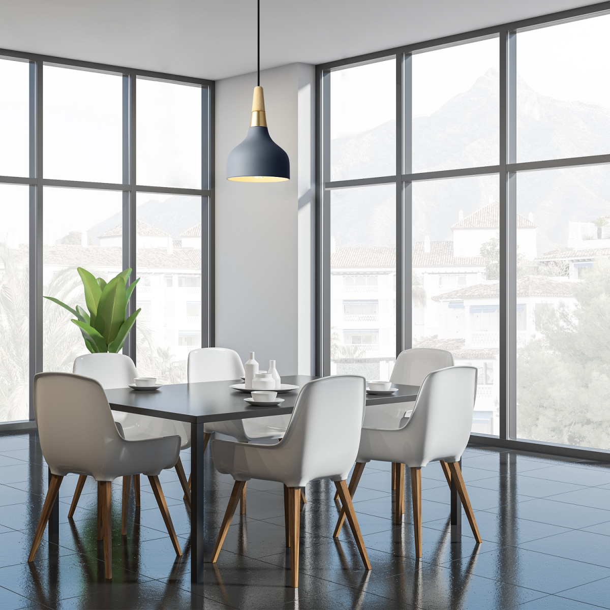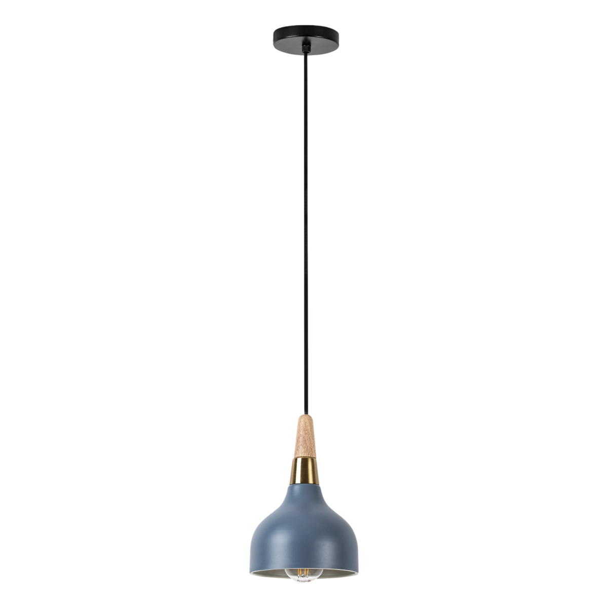 A függőlámpa fémből készült, amelyet fa kupak és arany színű díszítés tesz egyedivé. A szürke árnyalatú, lefelé szélesedő búra modern megjelenést kölcsönöz, miközben kellemesen fókuszált fényt biztosít. A kis méretű, fekete kerek dísztalp stabilan rögzíti a mennyezethez.
