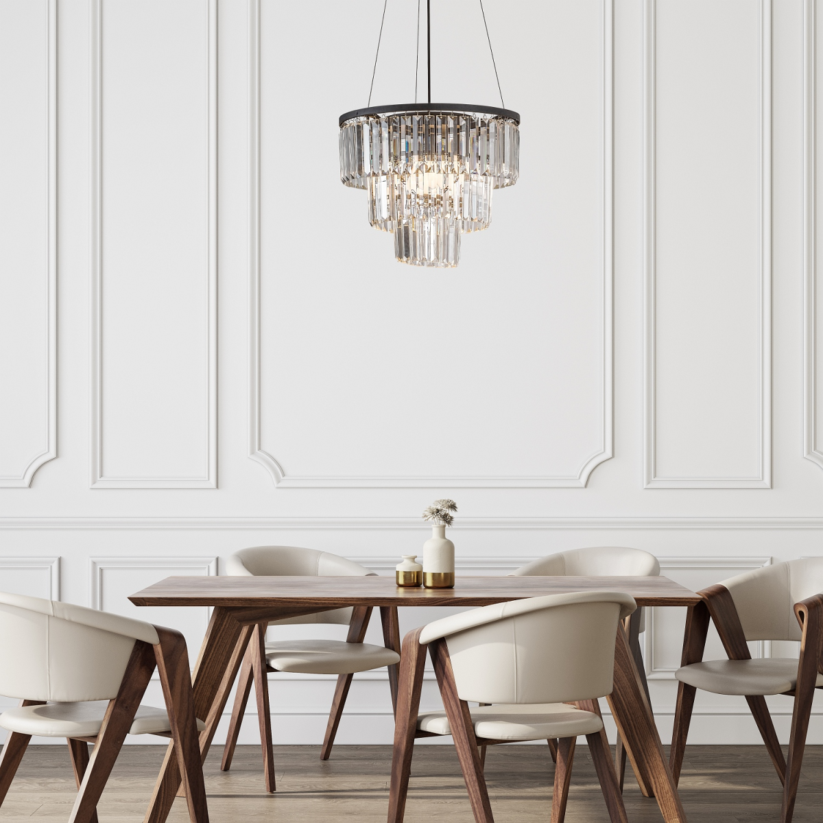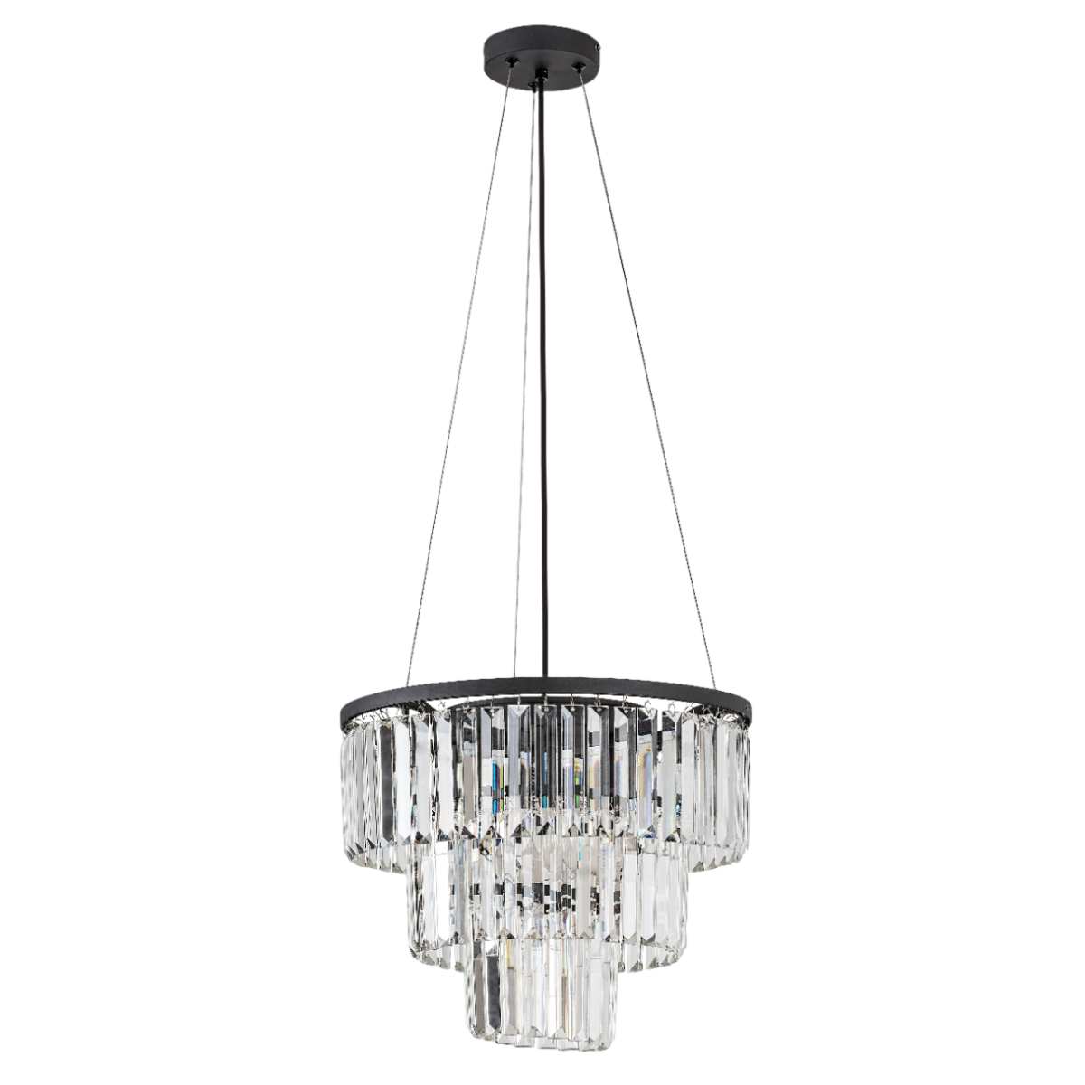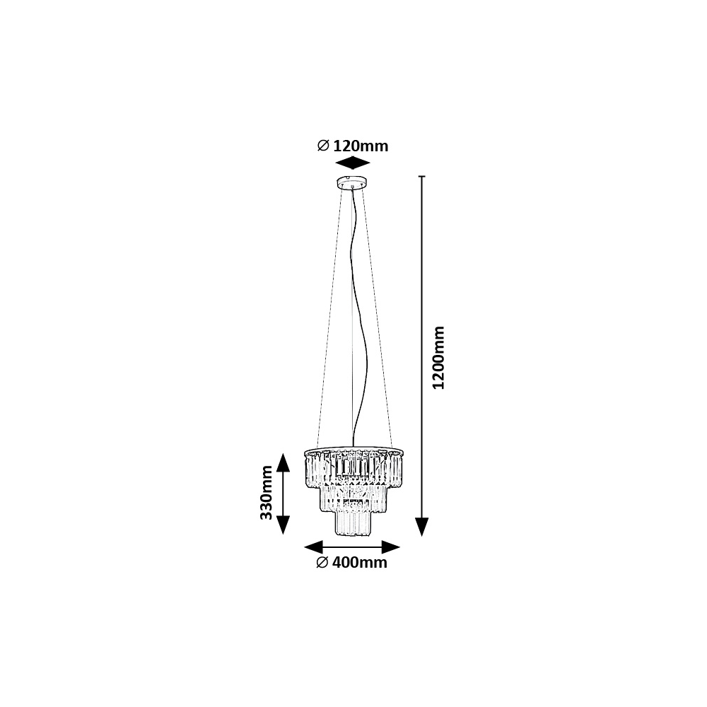 A klasszikus stílusú Eloisa függeszték elegáns választás a nappaliba, az étkezőbe vagy a hálószobába. A fémből készült, fekete színű lámpatestet átlátszó üvegfüggők három szintje egészíti ki. A kristályos csillogású függők körben függönyként takarják a fényforrást, és a lefelé csökkenő átmérőjű szintek jellegzetes csillár formát kölcsönöznek ennek a modellnek. Az Eloisa kisméretű, kerek, fekete dísztalp segítségével rögzíthető a mennyezetre. A függő lámpa három darab, egyenként legfeljebb 25 W teljesítményű fényforrással működtethető, a foglalatok típusa E27. Ha a hálószobában szereljük fel ezt a modellt, ajánlott meleg fehér fényű fényforrásokkal működtetni. Az ilyen fény pihenteti a szemet, ideális a kikapcsolódáshoz, és elősegíti a meghitt, otthonos hangulat megteremtését. Az Eloisa függeszték méretei a következők: átmérője 400 mm, a lámpafej magassága 330 mm, a lámpa belógása 1200 mm, beépítési átmérője 120 mm. Ezt a modellt fényforrások nélkül szállítjuk.