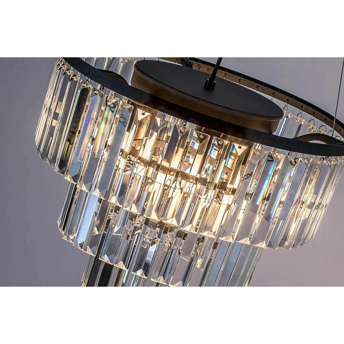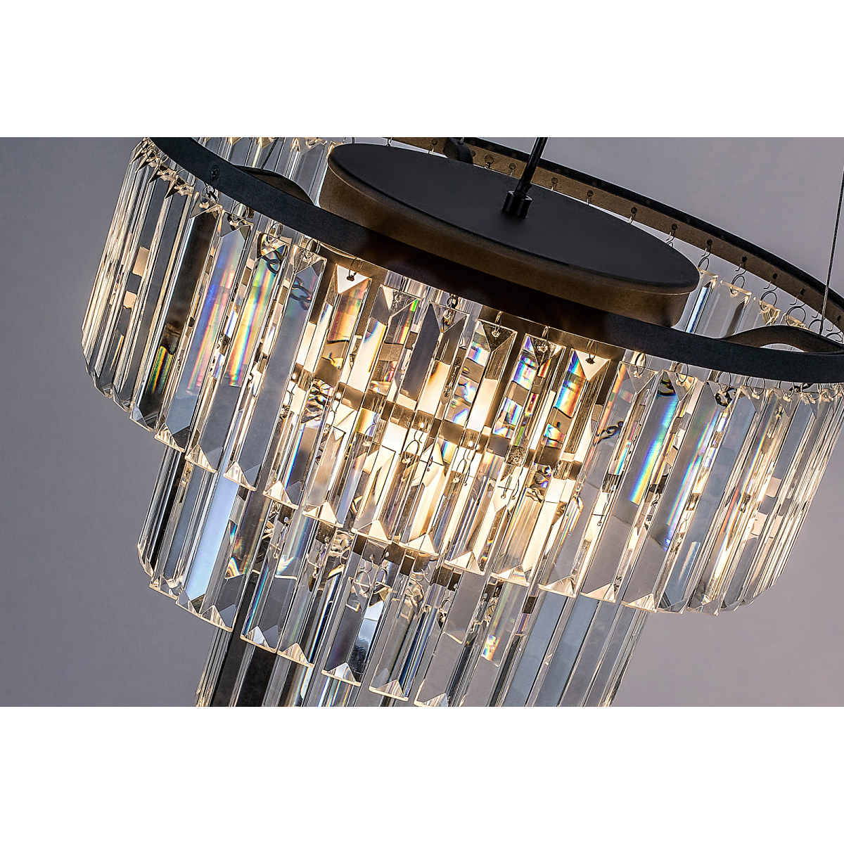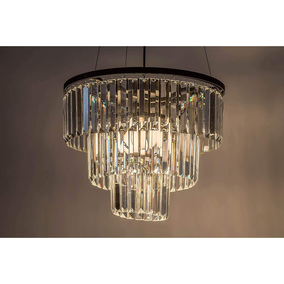 A klasszikus stílusú Eloisa függeszték elegáns választás a nappaliba, az étkezőbe vagy a hálószobába. A fémből készült, fekete színű lámpatestet átlátszó üvegfüggők három szintje egészíti ki. A kristályos csillogású függők körben függönyként takarják a fényforrást, és a lefelé csökkenő átmérőjű szintek jellegzetes csillár formát kölcsönöznek ennek a modellnek. Az Eloisa kisméretű, kerek, fekete dísztalp segítségével rögzíthető a mennyezetre. A függő lámpa három darab, egyenként legfeljebb 25 W teljesítményű fényforrással működtethető, a foglalatok típusa E27. Ha a hálószobában szereljük fel ezt a modellt, ajánlott meleg fehér fényű fényforrásokkal működtetni. Az ilyen fény pihenteti a szemet, ideális a kikapcsolódáshoz, és elősegíti a meghitt, otthonos hangulat megteremtését. Az Eloisa függeszték méretei a következők: átmérője 400 mm, a lámpafej magassága 330 mm, a lámpa belógása 1200 mm, beépítési átmérője 120 mm. Ezt a modellt fényforrások nélkül szállítjuk.