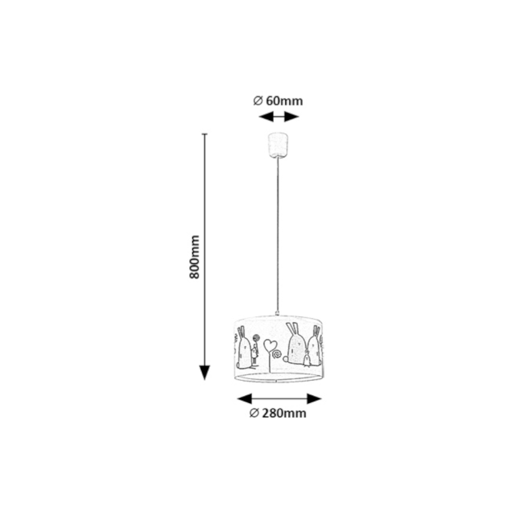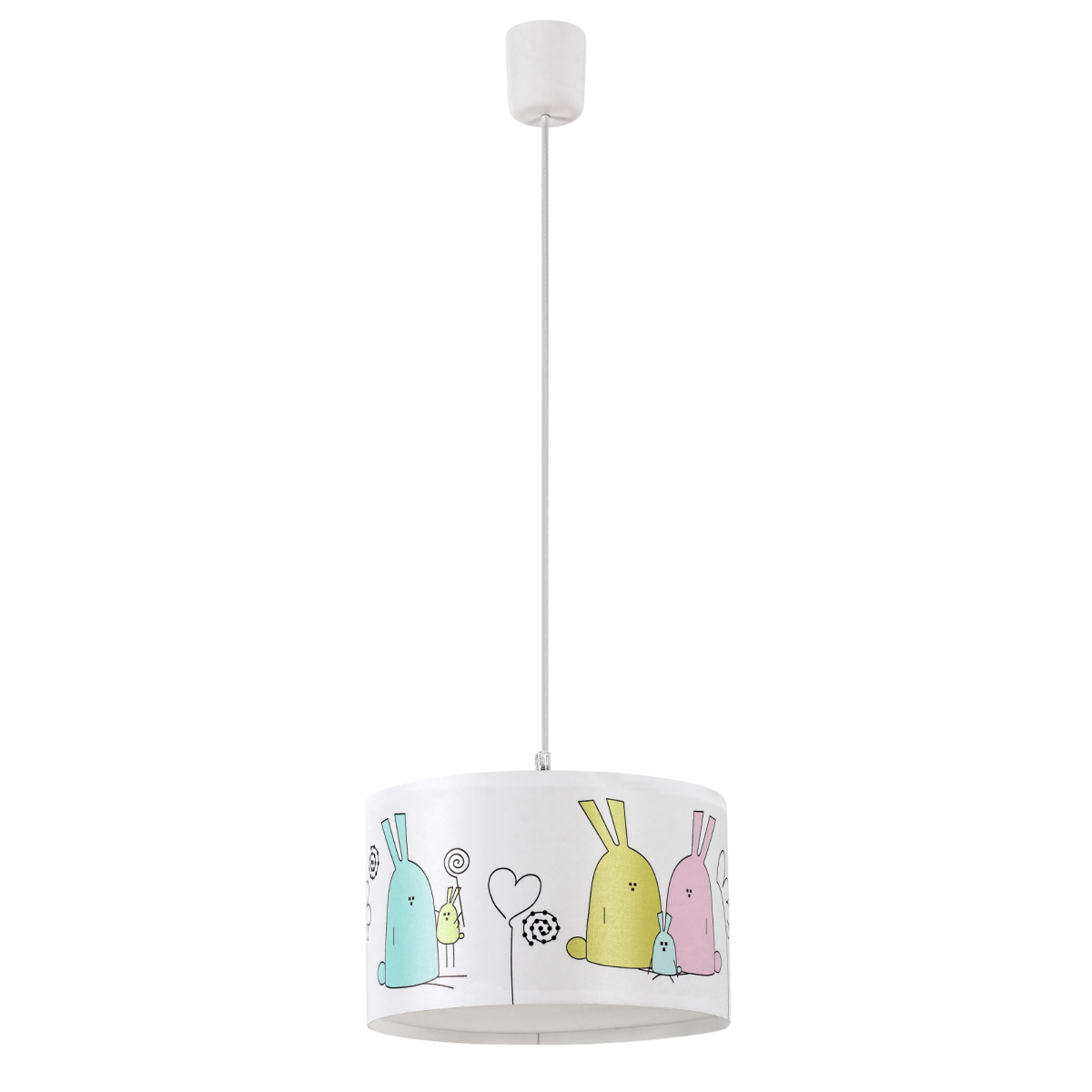 A Rábalux Flappy gyerek függeszték barátságos és vidám hangulatot teremt a gyerekszobában. Ideális választás mindazoknak, akik kedves, szívmelengető motívumokkal szeretnék még hívogatóbbá varázsolni a gyerekszobát. A függő lámpa fehér színben, műanyag testtel és szövet lámpabúrával készül. A búra henger alakú, alul nyitott, és színes, stilizált nyuszis motívumok díszítik. A minta uralkodó színei a kék, a rózsaszín és a sárga, melyek friss, üde hangulatot árasztanak.