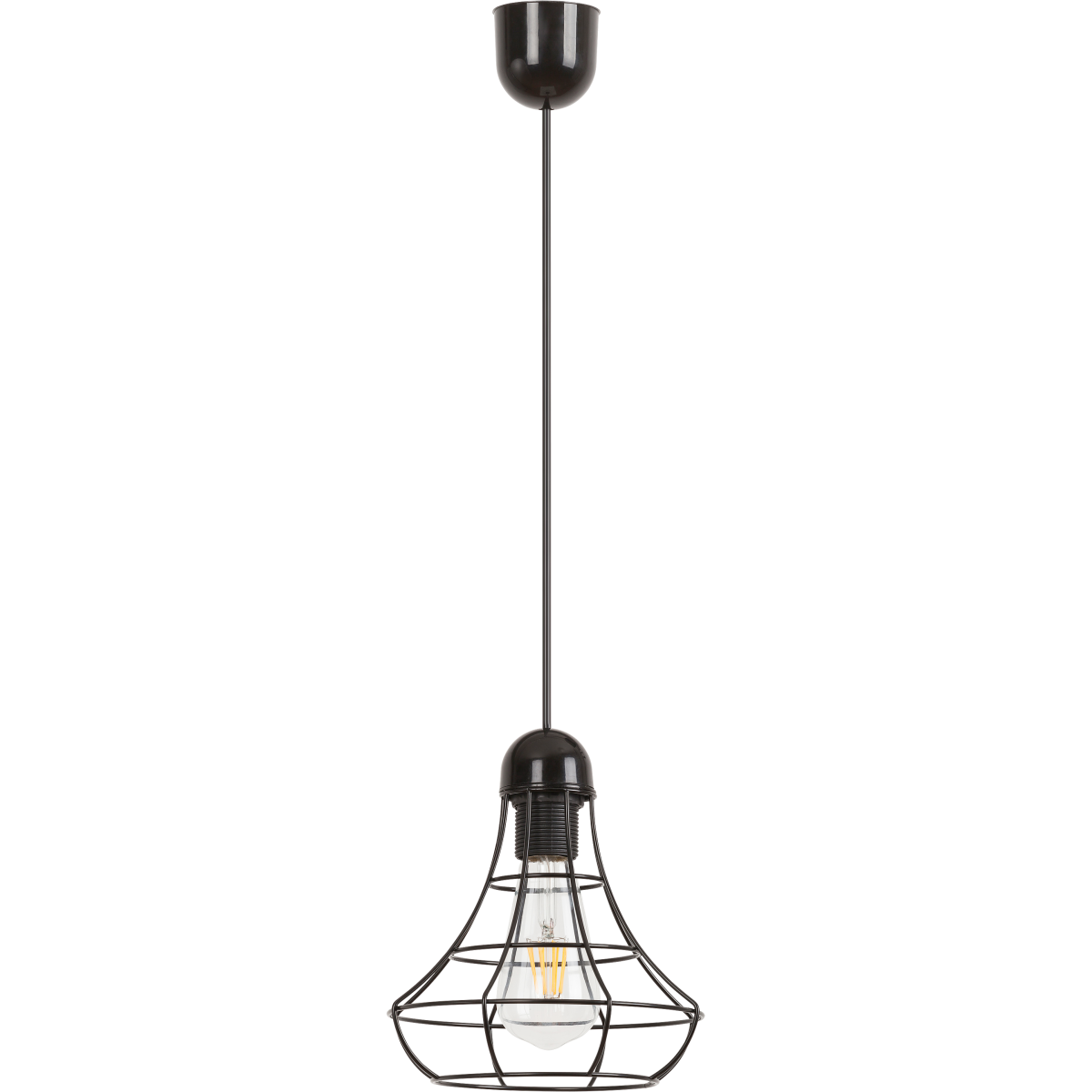 Indusztriális stílusú függeszték 1 db foglalattal. 98 cm lelógású, a lámpatestnél 20 cm átmérőjű, fekete színű, fémből készített lámpatest és lámpaernyő. A lámpatest E27-es foglalatkialakítású, maximum 60W teljesítményű fényforrással, így akár a szintén indusztriális megjelenésű, ST58-as formájú, energiatakarékos filament LED izzóval is használható.