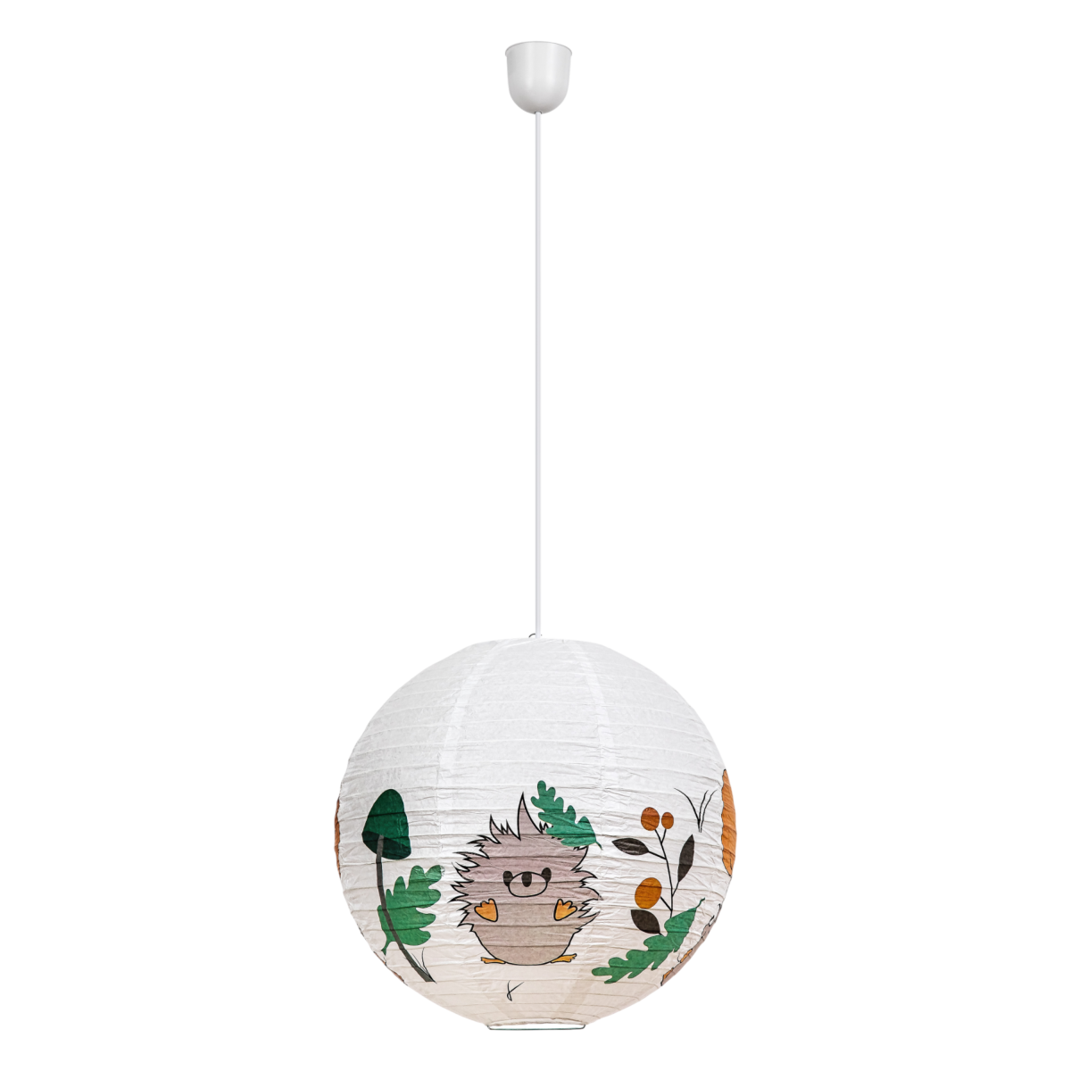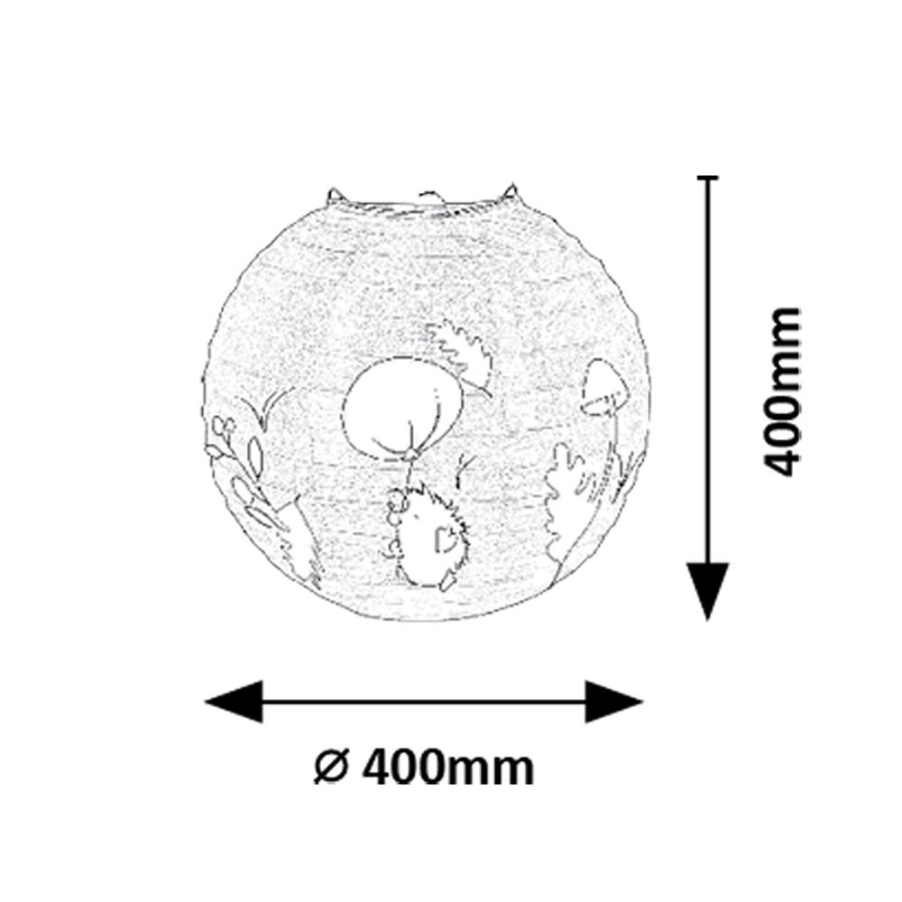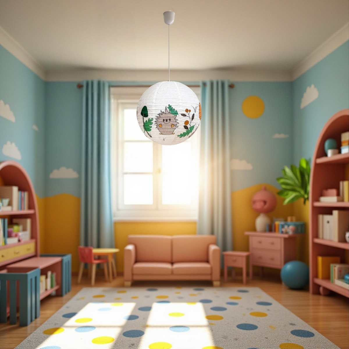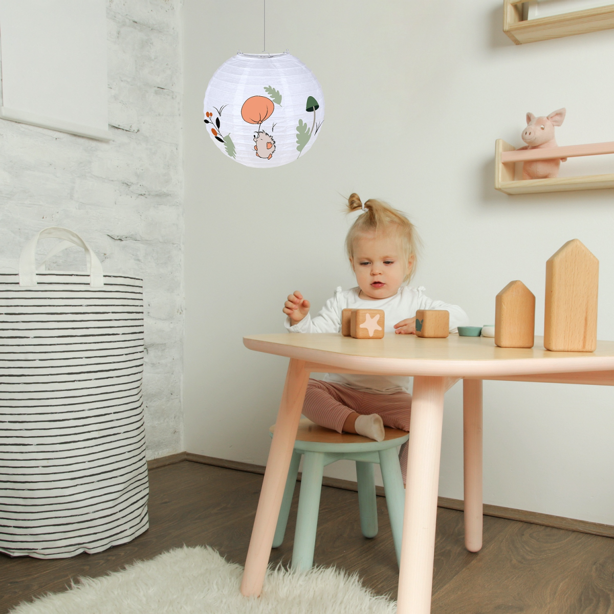 A lámpa gömbölyű formával, papírból készül, és kedves sünis-lufis minta díszíti, amely garantáltan a szoba lakójának szívébe lopja magát. A motívumok jellemző színei a narancs, a barna és a zöld árnyalatai, amelyek kellemesek, megnyugtatóak a szemnek, és melegséget sugároznak.