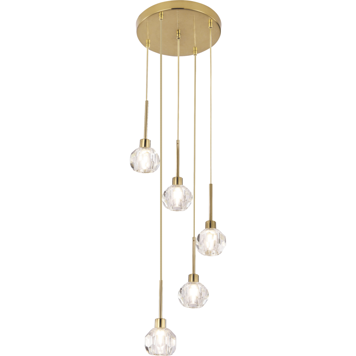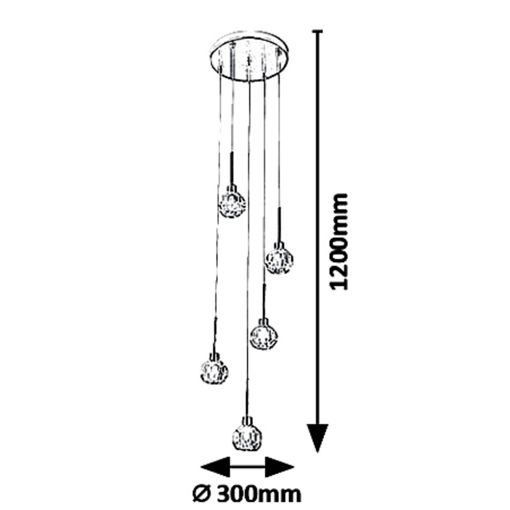 A fém és üveg kombinációjából készült klasszikus stílusú Kassia ötös függeszték nappalink valódi ékessége lehet. Ezt a modern és elegáns modellt azoknak ajánljuk, akik bátran egészítik ki otthonuk berendezését hangsúlyos, egyedi darabokkal. Az eltérő magasságban függő, gömb alakú, kristályszerű burák igen látványos világítási megoldást kínálnak. Az arany színű, nagyméretű, kerek dísztalppal szerelt Kassia öt darab, egyenként legfeljebb 5 W teljesítményű, energiatakarékos fényforrással használható, a foglalatok típusa G9. Ha az otthonos, meghitt hangulatot szeretnénk erősíteni a nappaliban, válasszunk a lámpához meleg fehér fényű fényforrásokat. A gyönyörű Kassia függeszték méretei a következők: átmérője 300 mm, belógása 1200 mm.
