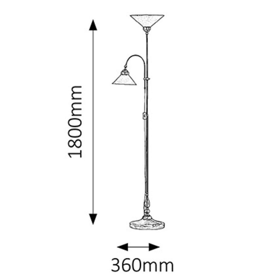 Klasszikus megjelenésű állólámpa 2 db foglalattal. 180 cm magas, 36 cm széles, bronz színű fém test és fehér színű üveg lámpabúrák, hálózati vezetékkel és kapcsolóval. A felső lámpatest és az olvasókar is egyaránt E27-es foglalatkialakítású, maximum 60W teljesítményű fényforrással használható.