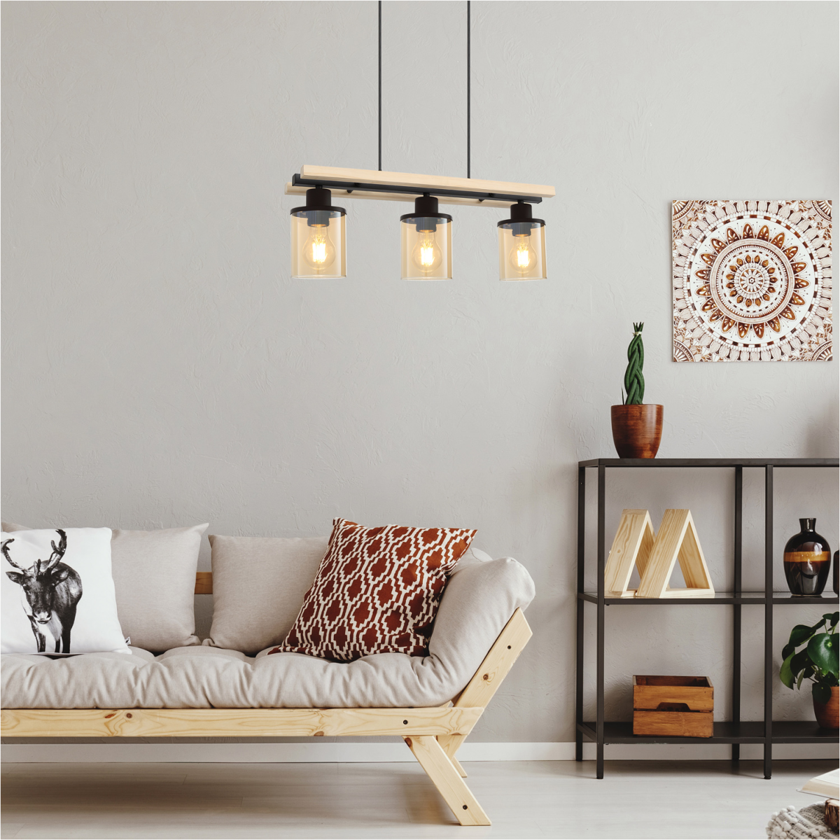A modern stílusú Nylah hármas függeszték a nappali berendezésének hangulatos darabja lehet. A fémből és fából készült fekete színű lámpát henger alakú, borostyánszínű üvegbúrák egészítik ki, amelyek meleg tónusokkal töltik meg a lámpafejek belsejéből kiszűrődő fényt. A Nylah téglalap alakú dísztalp segítségével rögzíthető a mennyezetre, és három darab, egyenként legfeljebb 25 W teljesítményű fényforrással használható. A foglalatok típusa E27. A lámpafejek sorban, egymás mellett helyezkednek el a kétoldalt fával szegélyezett tartórúdon.