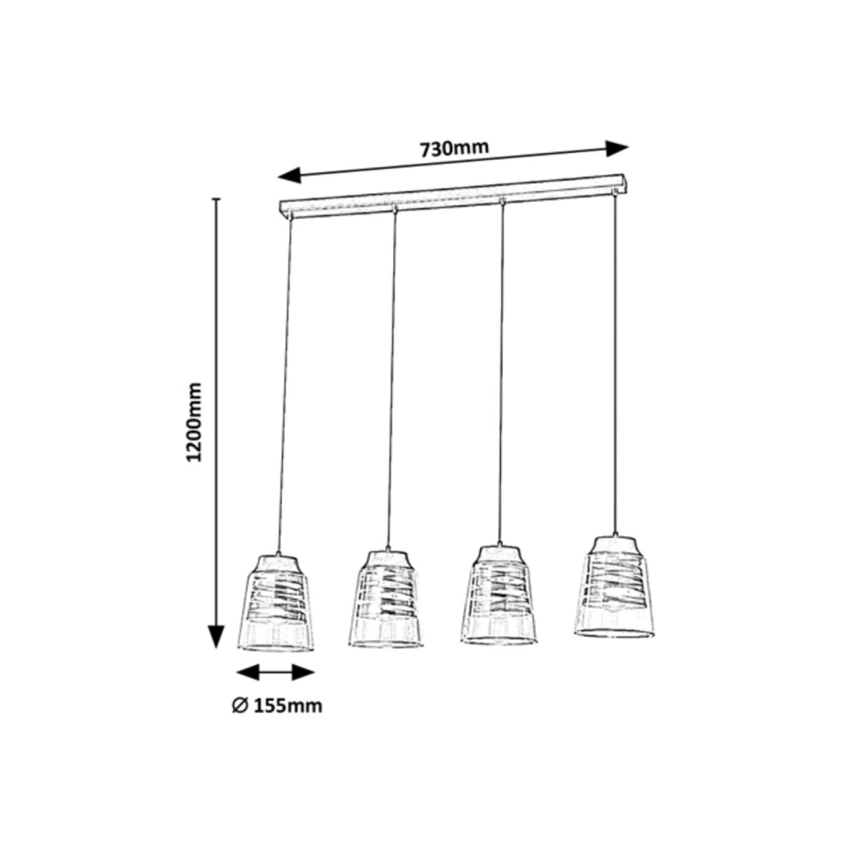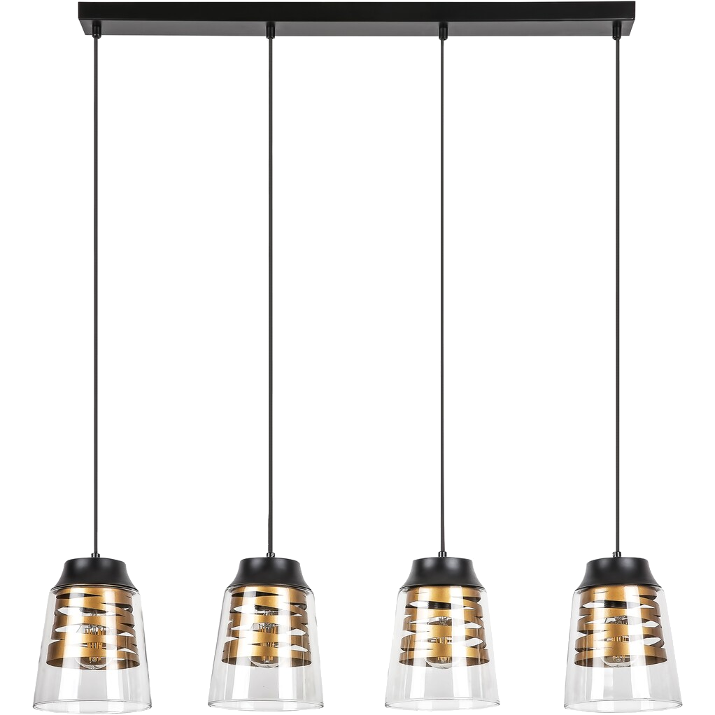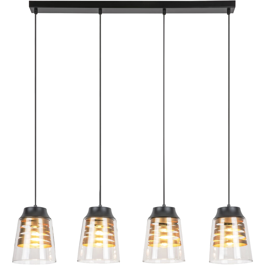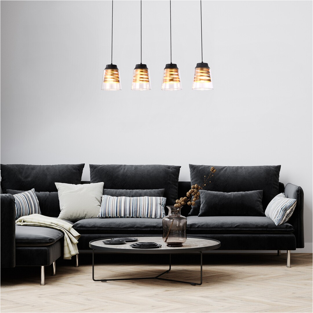 A modern stílusú Zenaida négyes függeszték modern nappalink, hálószobánk, étkezőnk vagy akár konyhánk berendezésének hangulatos darabja lehet. A fémből készült, matt fekete lámpatestet átlátszó üvegbúrák egészítik ki, belsejükben a fényforrást körülölelő aranyszínű, szalagszerű dekorációval. A lámpa hosszú, szögletes dísztalp segítségével rögzíthető a mennyezetre, a lámpafejeket textil tartókábelek kötik össze a dísztalppal. A Zenaida minden egyes lámpafeje olyan, mint egy dupla üvegpohárba töltött látványos, finom kávékülönlegesség, amely fejjel lefelé csüng a mennyezetről. Ez a modell négy darab, egyenként legfeljebb 60 W teljesítményű fényforrással használható, a foglalatok típusa E27. Ha a meghitt, otthonos hangulatot szeretnénk erősíteni, válasszunk hozzá meleg fehér fényű fényforrásokat. A négyes függeszték méretei a következők: szélessége 730 mm, egy-egy búra átmérője 155 mm, a lámpa belógása 1200 mm.