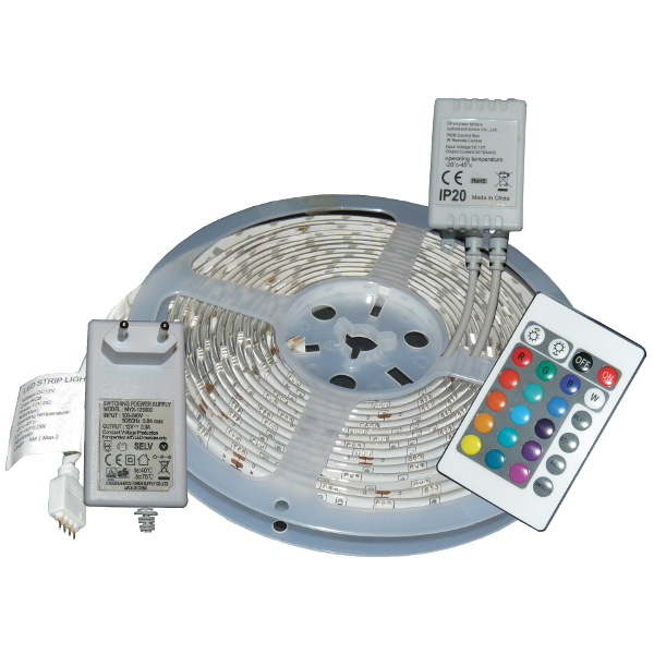 RGB LED szalag szett 5M,30x SMD5050 Epistar LED/M, KIT-5050-30D-RGB,IP65, kül- és beltéri használatra,Tápegység: DC12V 3Amp beltéri használatra,LED élettartam: 50000 óra,Távirányítható 24 gombbal: színváltás és fényerő szabályozás,Sugár szög: 120°,Teljesítmény: max. 7,2 W/m,Energiahatékonysága: A.