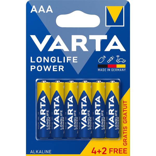 4+2 darabos, nagy teljesítményű Varta Longlife Power alkáli mikro elem (AAA).