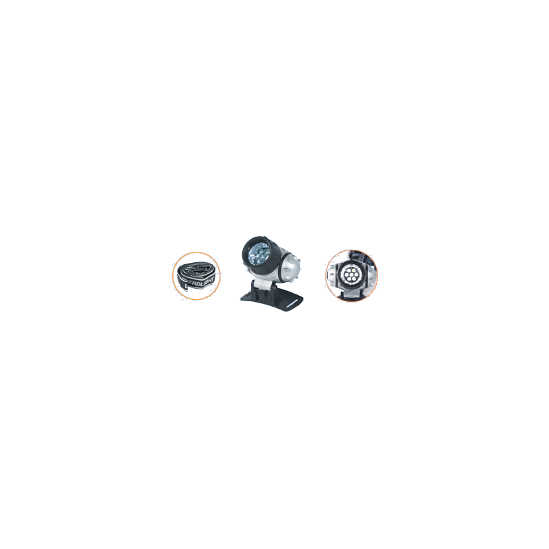 Fejlámpa 7 db szuperfényes LED-del, 3 különböző funkcióval: 1LED/3LED/7LED, hosszú élettartam, állítható dőlésszög: 135° , víznek ellenálló kivitel, tápellátás: 3xAAA (1,5V) elem, mely nem tartozéka a terméknek.