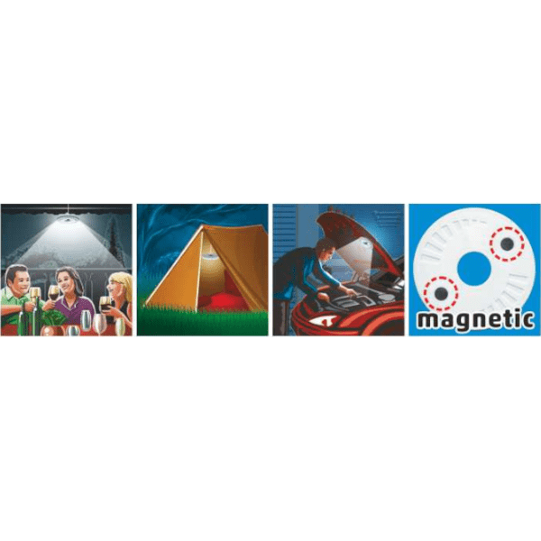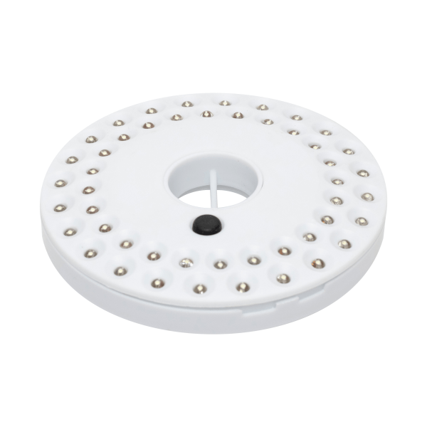 48 db LED, nagy fényerejű, alacsony fogyasztású, különleges LED fényforrás, 3 különböző funkció: 24 LED világít a külső sorban, 24 LED világít a belső sorban, 48 LED világít, masszív műanyag ház, kétféle rögzítési mód: mágneses és felakasztható, tápellátás: 3 x AA [1,5 V] elem; nem tartozék.