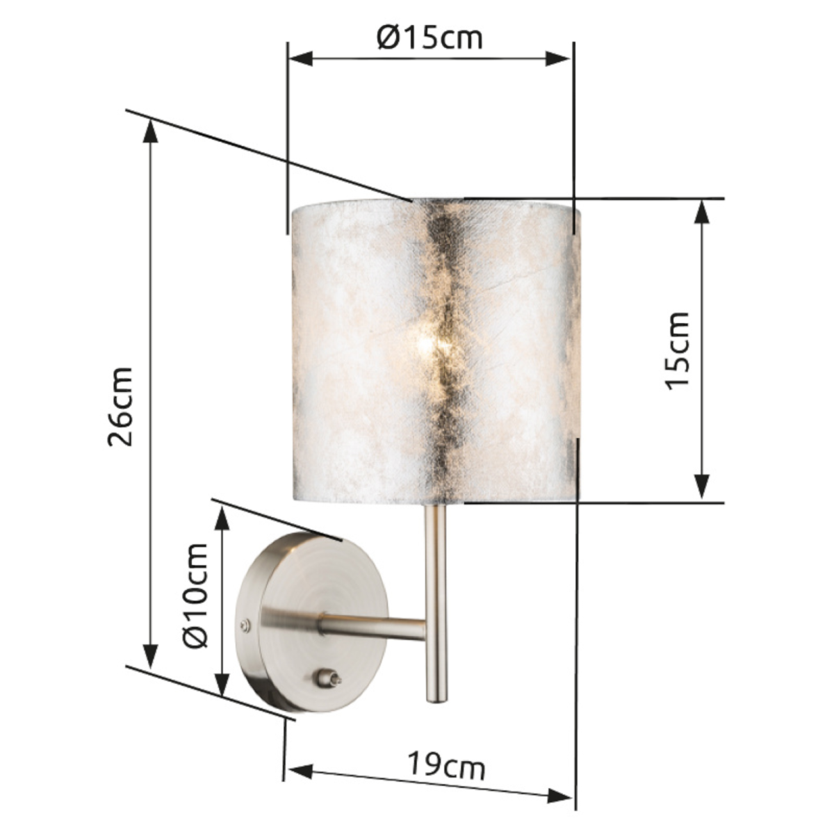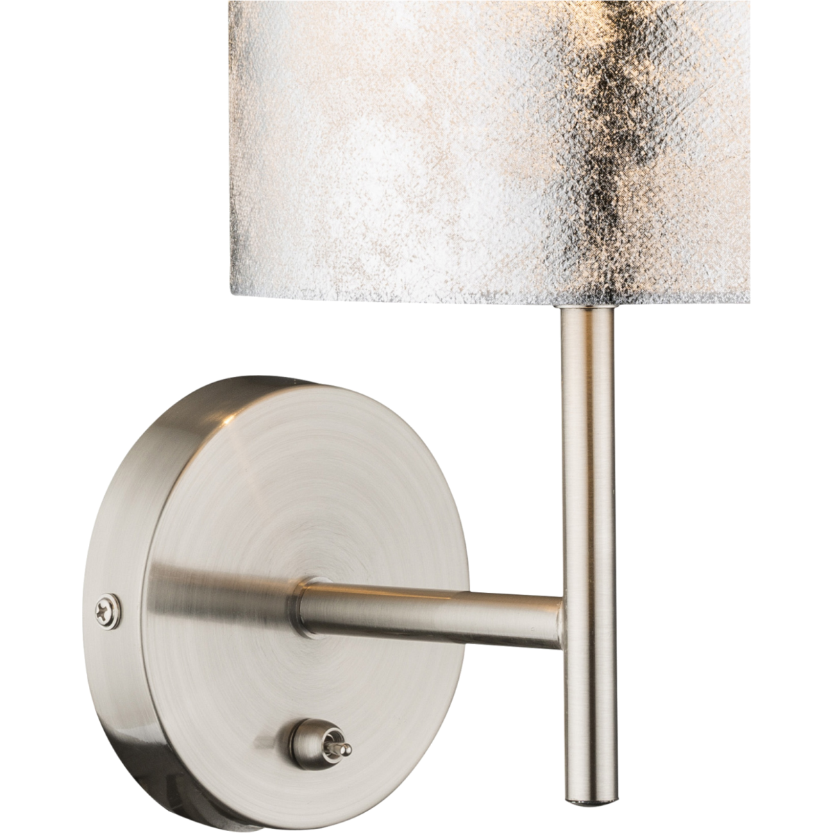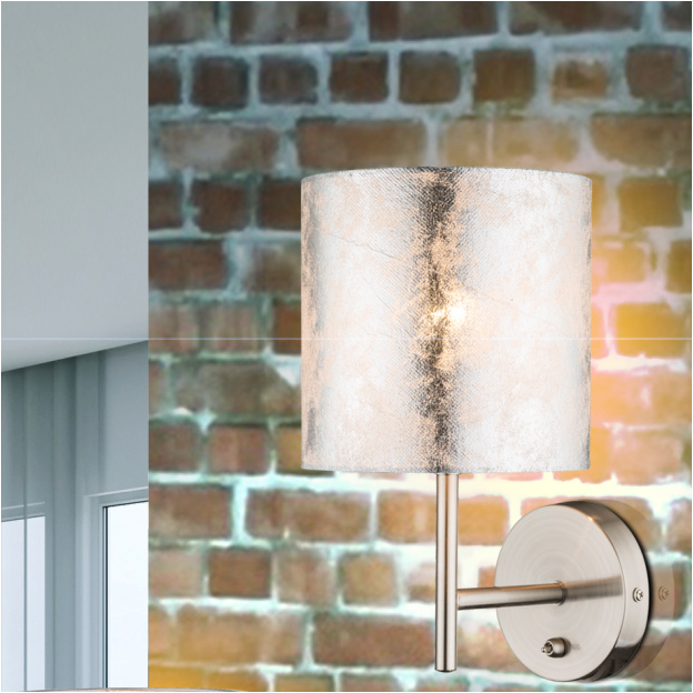 Szövetbúrás klasszikus fazonú falikar króm vázon, tetején ezüst szövet ernyővel. Ideális kiegészítője lehet a mennyezeti és függeszthető lámpáknak.