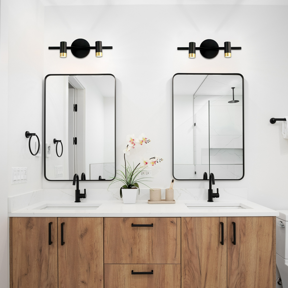 A Rábalux Kadir kettes fali LED lámpa elegáns, indusztriális stílusú kiegészítő, amely fekete-arany hengeres lámpatesttel és átlátszó műanyag búrával készült. A kerek dísztalpból vízszintes rúd nyúlik ki, amelyhez két lefelé irányuló lámpafej kapcsolódik. A lámpa kapcsolóval ellátott, IP44 védettsége révén pedig nemcsak nappaliban, hanem fürdőszobában is használható.