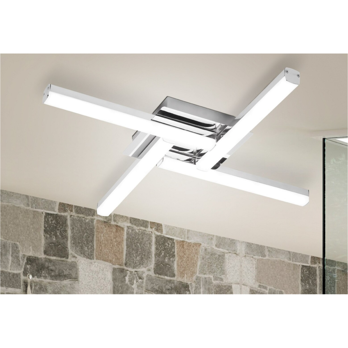 Modern megjelenésű fürdőszobai lámpa beépített energiatakarékos LED fényforrásokkal. 61 cm széles, króm színű fém lámpatest és fehér színű műanyag lámpabúrák, IP44-es, azaz por és fröccsenő víz elleni védelemmel. A beépített LED fényforrások 4x6W teljesítmény mellett 4x550 lumenes fényerőt, valamint 4000 Kelvines, természetes fehér színű fényt biztosítanak.