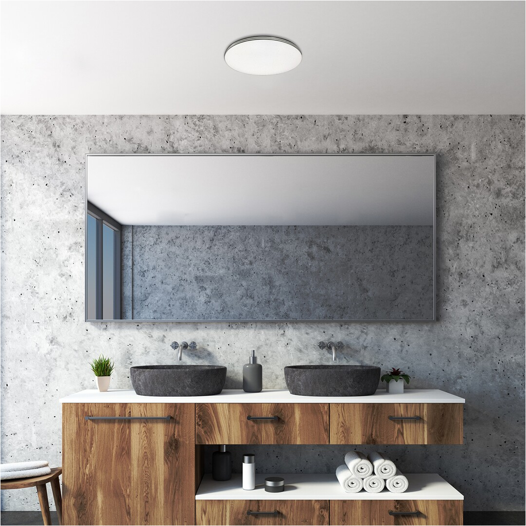 A csillogó effekttel ellátott Toma fürdőszobai lámpa nagyszerű választás, ha fürdőnk világítását egy modern, visszafogott megjelenésű mennyezeti lámpa segítségével szeretnénk megoldani. A fémből készült, krómszínű lámpatestet fehér akrilbúra egészíti ki. A kerek mennyezeti lámpa energiatakarékos, beépített LED fényforrással rendelkezik, amelynek teljesítménye 30 W, fényereje 2100 lumen, színhőmérséklete 4000 K. Természetes fehér fényt sugárzó fényforrás élettartama igazán fantasztikus: 50000 óra! A Toma fürdőszobai lámpa IP44-es védettséggel rendelkezik, amely garantálja, hogy legfeljebb 1 mm átmérőjű tárgyak behatolása ellen, valamint bármilyen irányból fröccsenő víz ellen védett. A mennyezeti lámpa átmérője 375 mm, mennyezettől mért távolsága 63 mm.
