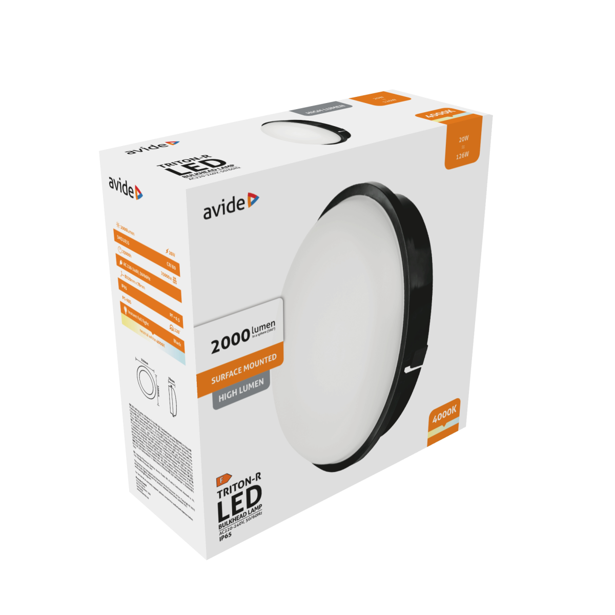 Avide TRITON-R LED kerek formájú mennyezeti lámpa 20W-os teljesítménnyel, természetes fehér (NW) világítási hőmérséklettel, fekete színben. Az IP65-ös magas védettségnek köszönhetően szinte bárhol megállja a helyét, kiválóan alkalmas mind kültéri, mind beltéri használatra. Ideális választás fürdőszoba, garázs, pince és a kert megvilágításához is. Az IP65 besorolással rendelkező lámpák teljesen védettek por és vízsugár ellen, így ennek révén sokféle környezetben használhatók. Egyszerűen installálhatók szinte bármilyen felületre, és bekötés után azonnal használhatók. Ezek a lámpák SMD LED-ekkel vannak felszerelve, így egyenletesebb és szórtabb fényt tudnak biztosítani, hagyományos izzóval szerelt társaiknál sokkal kevesebb energiafelhasználás mellett.