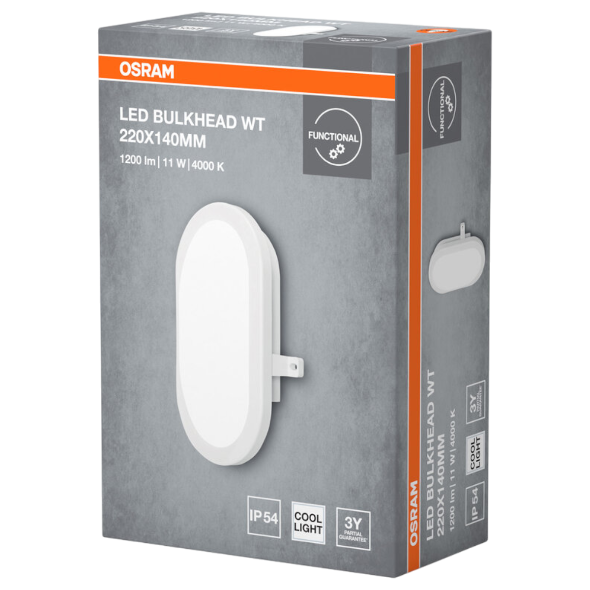 Az Osram Bulkhead LED hajólámpa praktikus és megbízható világítási megoldás beltéri és kültéri használatra egyaránt. Az ovális formatervezésű, fehér színű lámpatest egyszerűen illeszthető különböző környezetekbe, míg az IP54 védelem gondoskodik arról, hogy a készülék ellenálljon a por és fröccsenő víz hatásainak. A beépített LED fényforrás 11 W teljesítményű. A LED-el felszerelt lámpatest 1200 lm-es fényforrást biztosít 840 lm-es kibocsátás mellett (búrával kibocsátott fényárama 840 lumen). Fehér (4000 K) fényével tiszta és kellemes megvilágítást nyújt. A falra szerelhető kialakítás miatt ideális választás lehet folyosók, mellékhelyiségek, előterek, garázsok vagy kültéri fedett területek világítására.