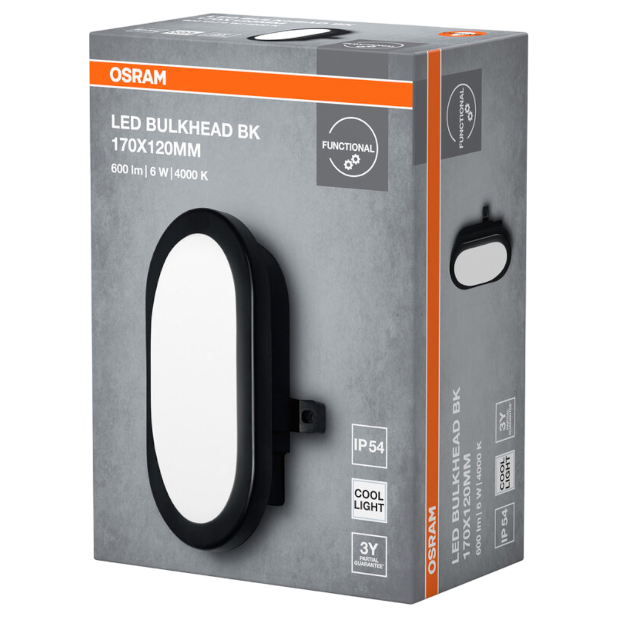 Az Osram (Ledvance) Bulkhead L LED hajólámpa praktikus és tartós világítási megoldás beltéri és kültéri használatra. Ovális formájú, fekete színű lámpatesttel és fehér búrával rendelkezik, amely letisztult, modern megjelenést biztosít. A beépített LED fényforrás 6 W teljesítményű. A LED-el felszerelt lámpatest 600 lm-es fényforrást biztosít 420 lm-es kibocsátás mellet (búrával kibocsátott fényárama 420 lumen). Természetes fehér (4000 K) fényével tiszta és kellemes megvilágítást nyújt. Az IP54-es védelemnek köszönhetően ellenáll a por és fröccsenő víz hatásainak, így kültéren – fedett helyeken – is biztonsággal alkalmazható. Egyszerűen, falra szerelhető kialakítása miatt sokoldalúan használható.