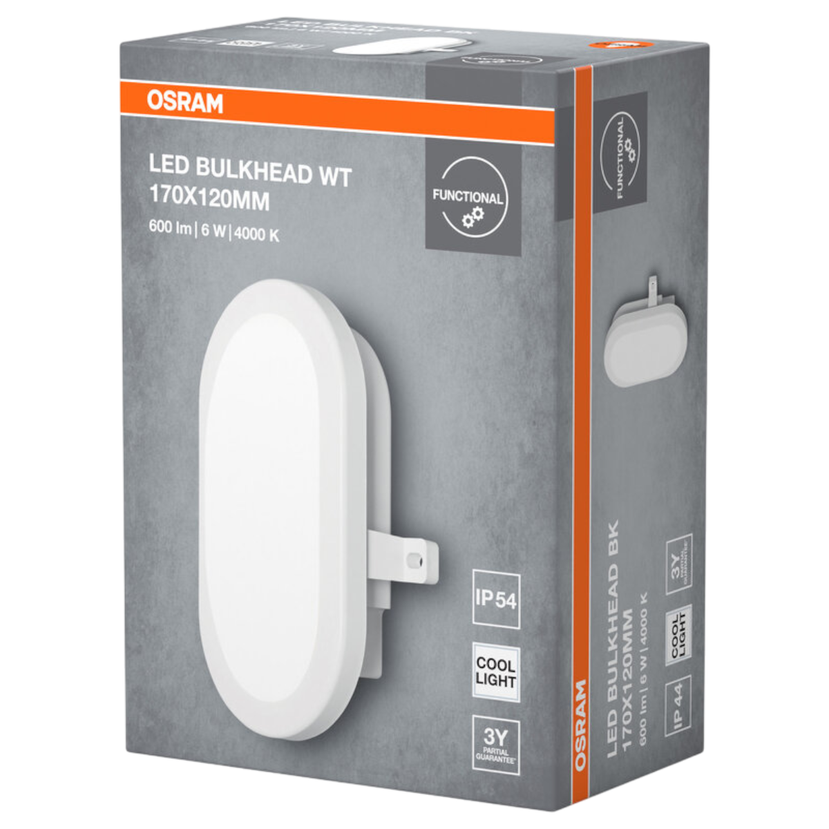 Az Osram (Ledvance) Bulkhead L LED hajólámpa egyszerű és megbízható világítási megoldás beltéri és kültéri használatra. Ovális formájú, fehér színű lámpatesttel és opál búrával készül, amely egységes és modern megjelenést biztosít. A beépített LED fényforrás 6 W teljesítménnyel működik. A LED-el felszerelt lámpatest 600 lm-es fényforrást biztosít 420 lm-es kibocsátás mellet (búrával kibocsátott fényárama 420 lumen). Természetes fehér (4000 K) fénye tiszta és kellemes megvilágítást nyújt. Az IP54-es védelem biztosítja, hogy a lámpa ellenálljon a por és fröccsenő víz hatásainak, így kültéri fedett helyeken is biztonsággal alkalmazható. Falra szerelhető kivitelének köszönhetően praktikus és sokoldalú választás.