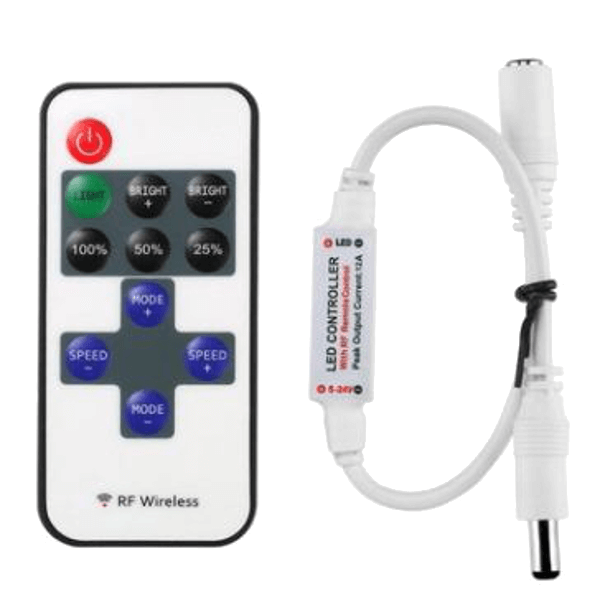 Az Avide Mini LED-szalag vezérlővel az egyszínű LED-szalagok világítása vezérelhető. A mellékelt rádiófrekvenciás távirányítón található 11 gomb segítségével lehetőségünk van a LED-szalag be- és kikapcsolására, fényerőszabályzásra és különböző effektek megjelenítésére. Ezzel a LED szalag vezérlővel és távirányítóval 1 darab, egyszínű LED-szalag vezérelhető. Világítási módok: 1.Statikus, beállítható fényerő 2. Villogás 3. Lélegzés effekt 4. Felvillanás 5. Egymás után villogás négyszer és ezek különböző kombinációi egy világítási módban. Összesen 10 féle dinamikus móddal rendelkezik a vezérlő.