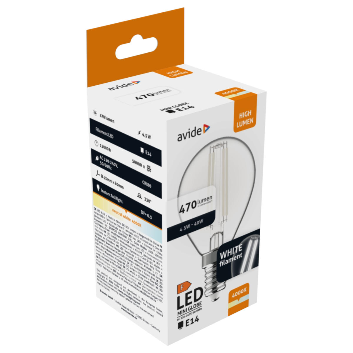 Az Avide LED White mini filament gömbizzó energiatakarékos megoldás kis méretű lámpatestekhez. Klasszikus forma és modern LED-technológia jellemzi: a 4,5 wattos teljesítmény egy 40 wattos hagyományos izzót vált ki, miközben semleges fehér fényt (4000K) biztosít. Kompakt mérete miatt ideális fürdőszobai tükrökbe, konyhai spotlámpákba vagy kisebb csillárokba.