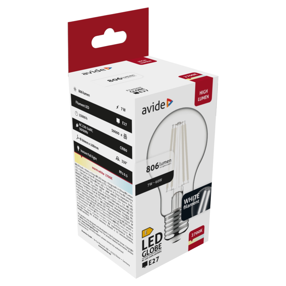 Az Avide LED White filament gömbizzója modern technológiával kínálja a hagyományos izzók megjelenését és hangulatát. Az E27-es foglalatnak köszönhetően könnyen beilleszthető a legtöbb szabványos lámpatestbe, a melegfehér (2700K) fény pedig kellemes, otthonos légkört teremt bármely helyiségben. A 7 wattos teljesítménye mellett 806 lumen fényáramot biztosít, így ideális általános világításra, miközben jelentősen kevesebb energiát fogyaszt, mint egy hagyományos 60W-os izzó.