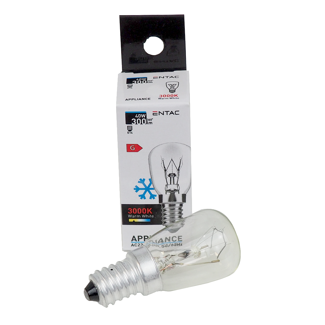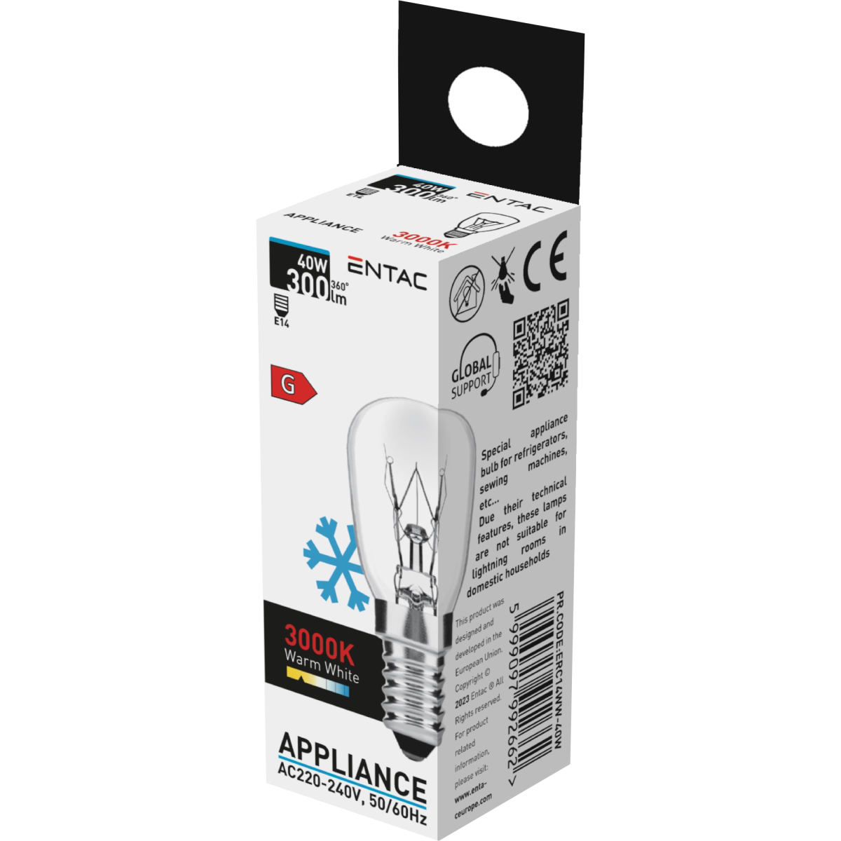 Az Entac 40W teljesítményű, E14-es foglalatú, meleg fényű (3000K) hűtőizzó.