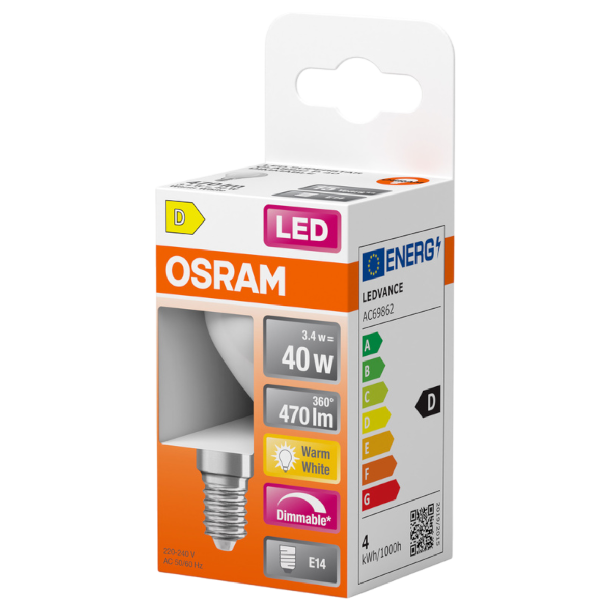 Az OSRAM LED Superstar kisgömb fényforrás matt üveg burával és E14-es foglalattal klasszikus formát és modern LED technológiát ötvöz. A 3,4W teljesítmény 470 lumen fényáramot biztosít, amely meleg, 2700K színhőmérsékletű fényt bocsát ki. A dimmelhető funkciónak köszönhetően a fényerő igény szerint szabályozható, így mindig a kívánt hangulatot teremtheted meg. Akár 15 000 órás élettartamával hosszabb használatot kínál.