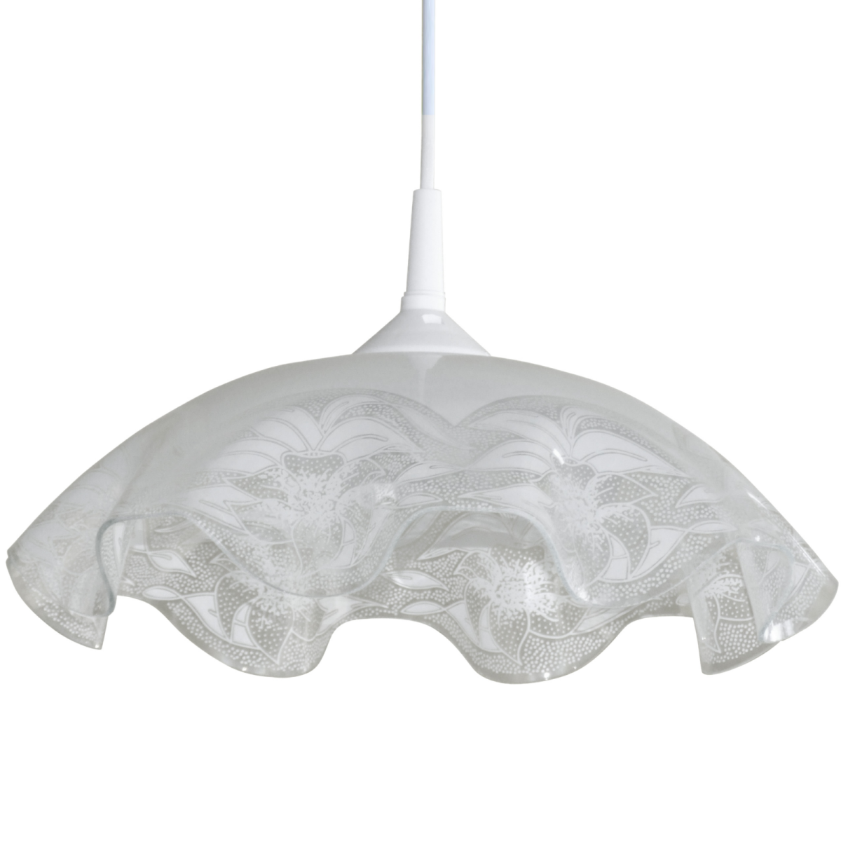 Fehér, virágmintás üveg függeszték, E27 foglalattal. - Átmérő: 320 mm - Magasság: 840 mm