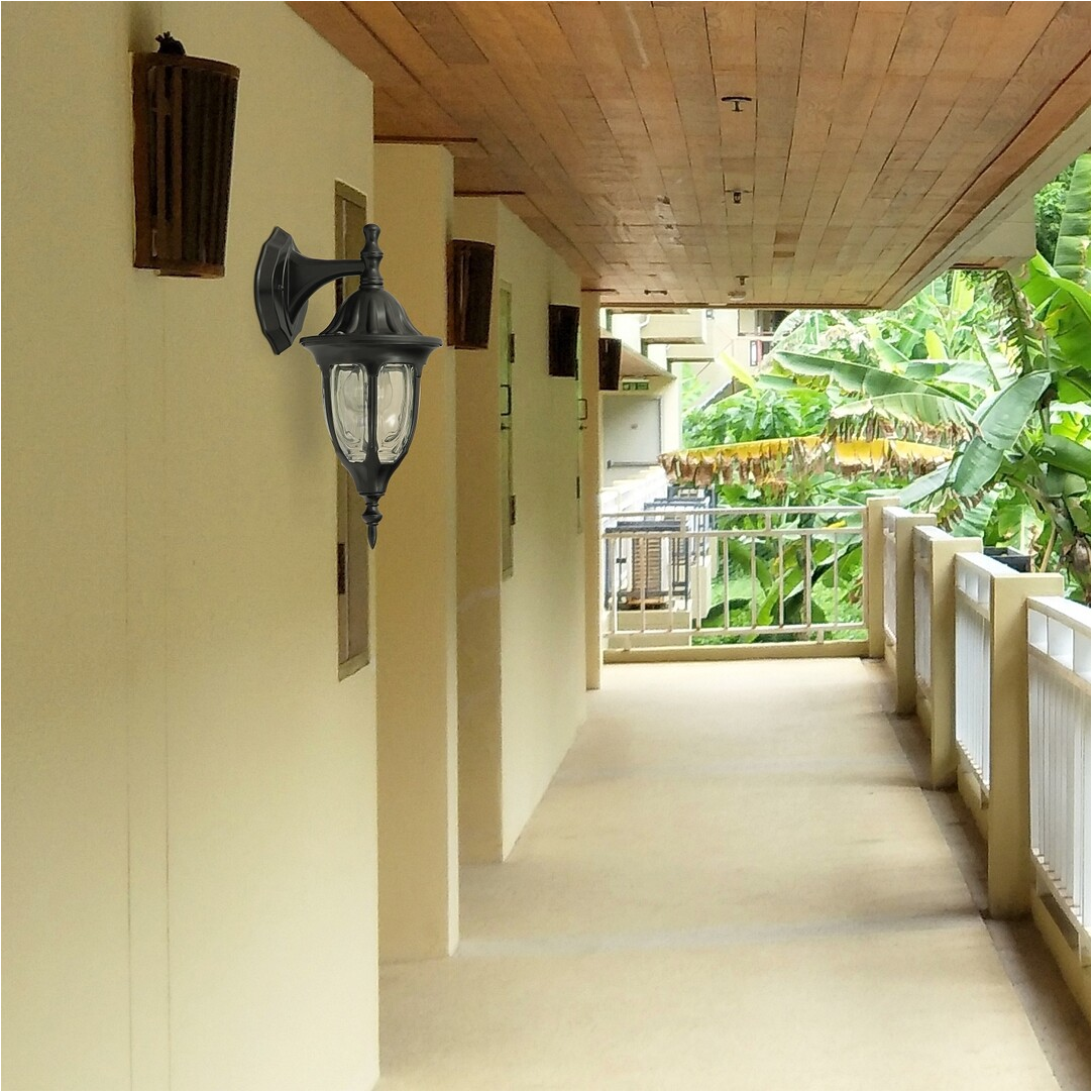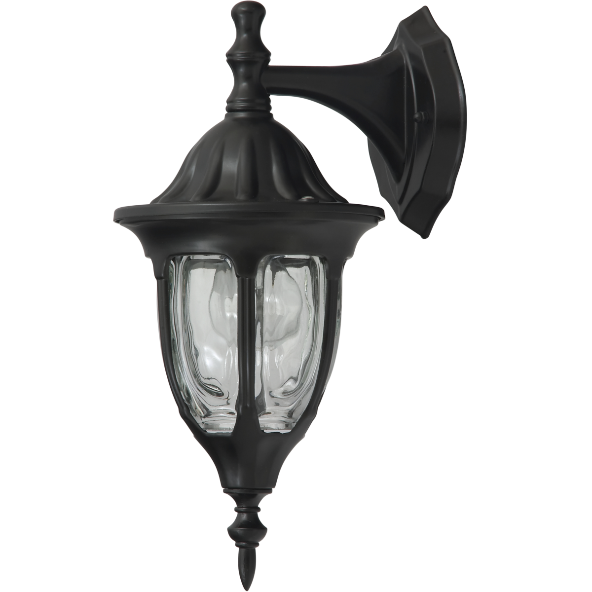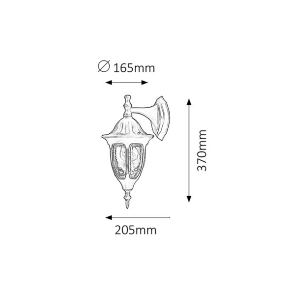 Klasszikus megjelenésű kültéri falikar 1 db E27-es foglalattal, mely maximum 60W teljesítményű fényforrással használható. 20,5 cm kinyúlású, 37 cm magas, fekete színű, fémből készített lámpatest és üvegbúra, IP43-as védettséggel.