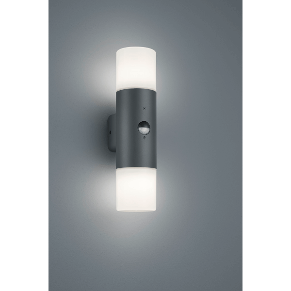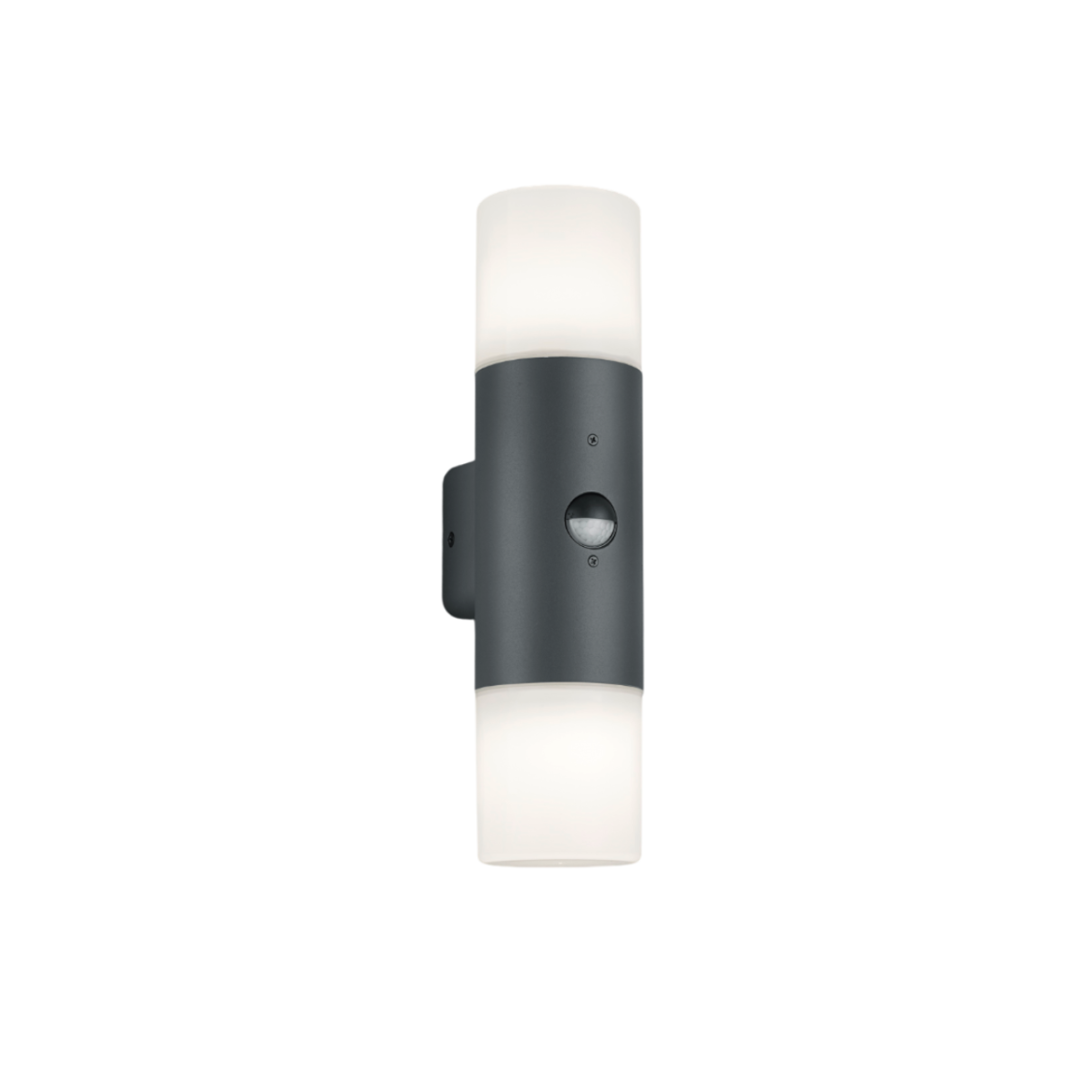 Hoosic kültéri fali lámpa 2xE27 foglalattal; magassága 33 cm, átmérője 8,5 cm. A termék IP44-es minősítéssel rendelkezik. Színe antracit. A fali világítótest le-fel világít, s mozgásérzékelővel van ellátva.