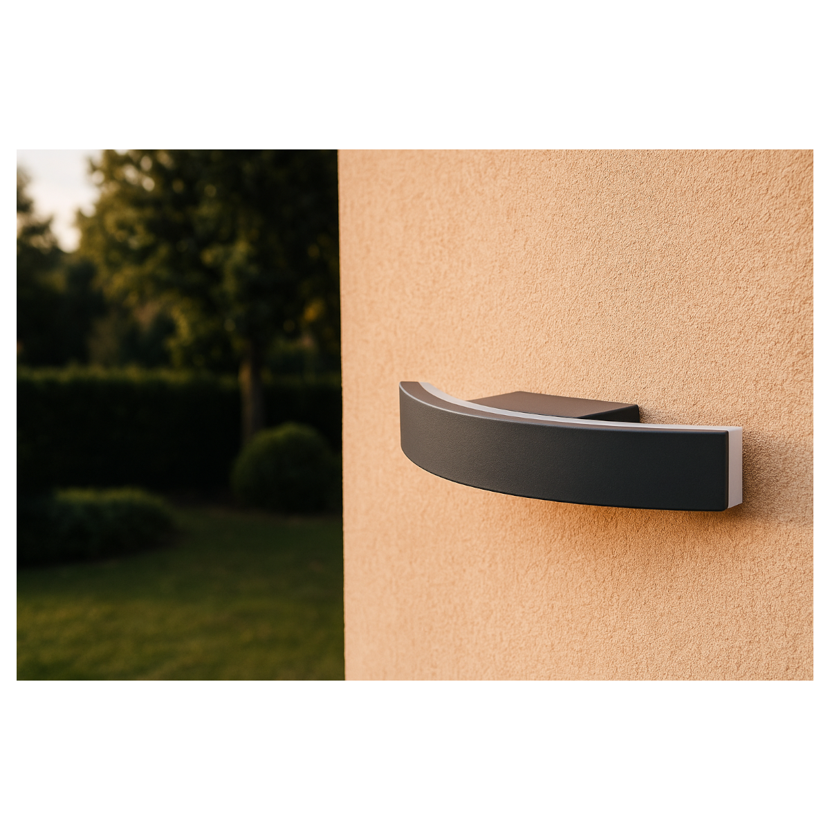 Sötétszürke ívelt háza és 3000 K-es melegfehér fénye hangulatos megvilágítást teremt a kültéri terekben, miközben az IP54-es védelemnek köszönhetően ellenáll az időjárás viszontagságainak. A 7 wattos teljesítmény energiatakarékos működést biztosít hosszabb élettartam mellett.