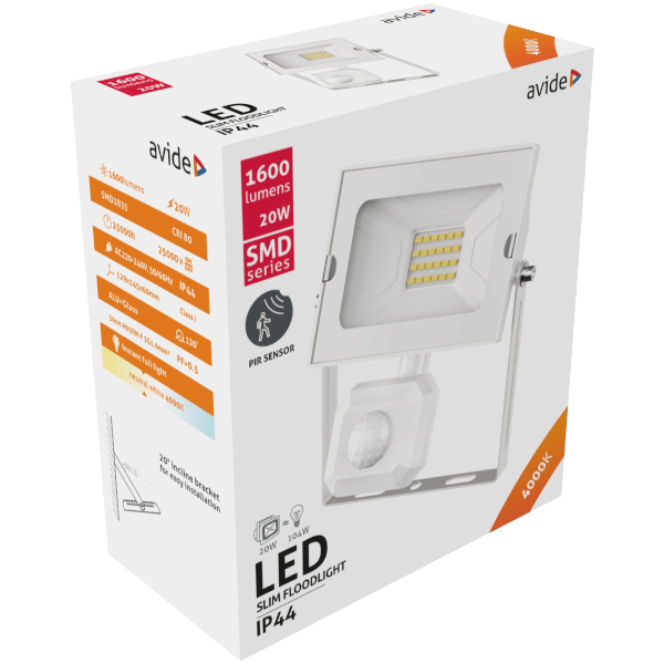 Az Avide SMD Reflektorok elérhetők beépített PIR mozgásérzékelős szenzorral is. A reflektor hátulján lévő 2 darab potméter segítségével könnyen beállítható az érzékelési távolság és a világítás hossza az Ön igényeinek megfelelően. A PIR mozgásérzékelővel szerelt reflektorok is alkalmasak bel- és kültéri használatra az IP44-es besorolásnak köszönhetően és ezek is rendelkeznek egy mozgatható fém kerettel, amivel könnyedén rögzíthető szinte bárhová. Az Avide SMD LED-es reflektorok a hagyományos halogén izzós reflektorokkal szemben ugyan azt a fényerősséget sokkal kevesebb villamos áram igénybevételével is tudják biztosítani, így egy csere után jelentős mértékű megtakarítás érhető el. A LED reflektorok akár 20-szor hosszabb élettartamot biztosítanak a hagyományos izzóval szerelt társaikhoz képest. A LED reflektorok 30 cm-es szabad kábelvéggel kerülnek forgalomba és a csomag dugvillát nem tartalmaz! A termék üzembe helyezését csak szakember végezheti! Bármilyen művelet bekapcsolt tápfeszültség mellett elektromos áramütés veszélyével járhat.