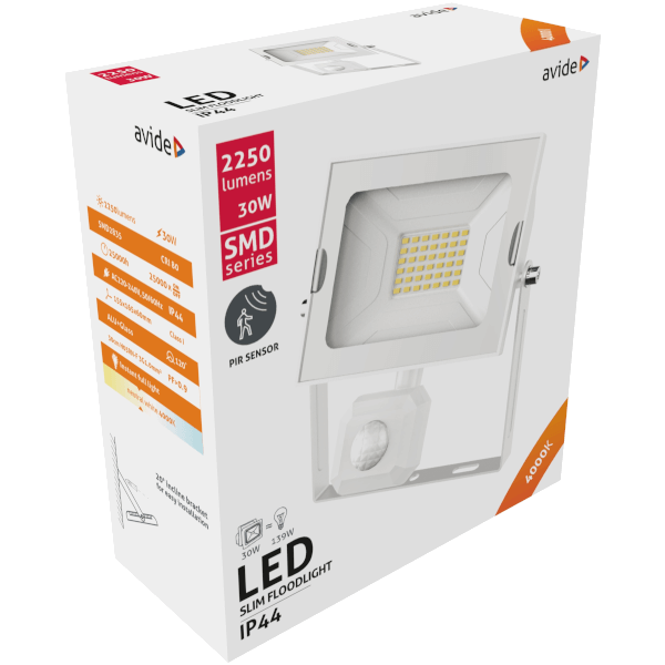 Az Avide SMD Reflektorok elérhetők beépített PIR mozgásérzékelős szenzorral is. A reflektor hátulján lévő 2 darab potméter segítségével könnyen beállítható az érzékelési távolság és a világítás hossza az Ön igényeinek megfelelően. A PIR mozgásérzékelővel szerelt reflektorok is alkalmasak bel- és kültéri használatra az IP44-es besorolásnak köszönhetően és ezek is rendelkeznek egy mozgatható fém kerettel, amivel könnyedén rögzíthető szinte bárhová. Az Avide SMD LED-es reflektorok a hagyományos halogén izzós reflektorokkal szemben ugyan azt a fényerősséget sokkal kevesebb villamos áram igénybevételével is tudják biztosítani, így egy csere után jelentős mértékű megtakarítás érhető el. A LED reflektorok akár 20-szor hosszabb élettartamot biztosítanak a hagyományos izzóval szerelt társaikhoz képest. A LED reflektorok 30 cm-es szabad kábelvéggel kerülnek forgalomba és a csomag dugvillát nem tartalmaz! A termék üzembe helyezését csak szakember végezheti! Bármilyen művelet bekapcsolt tápfeszültség mellett elektromos áramütés veszélyével járhat.