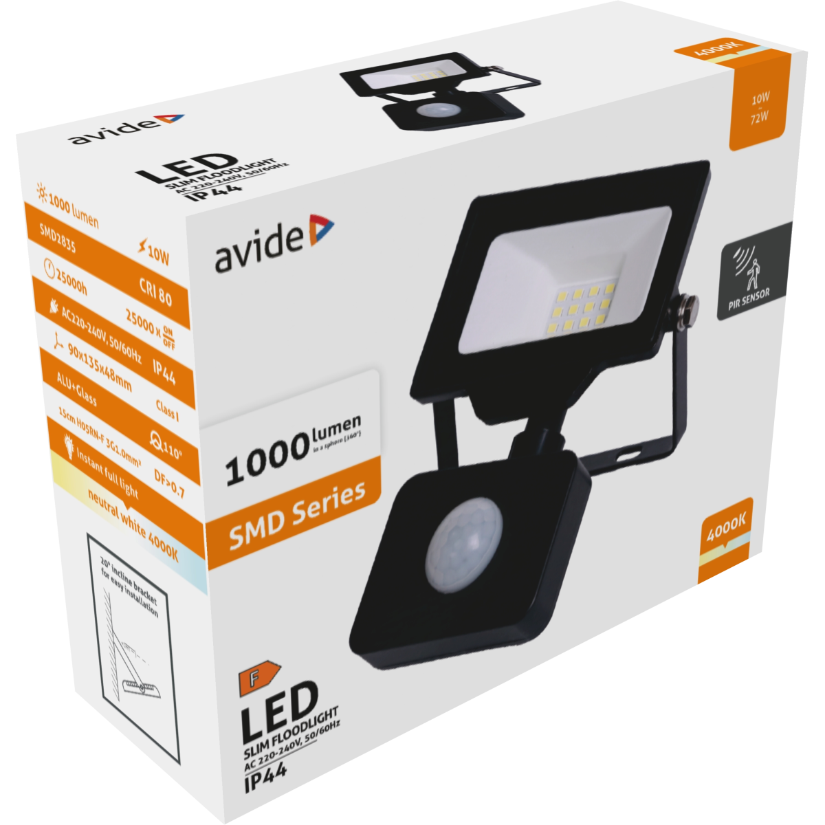 Avide SMD Reflektor beépített PIR mozgásérzékelő szenzorral. A reflektor hátulján lévő 2 darab potméter segítségével könnyen beállítható az érzékelési távolság és a világítás hossza az Ön igényeinek megfelelően. Alkalmas bel- és kültéri használatra az IP44-es besorolásnak köszönhetően. Mozgatható fém kerettel rendelkezik, amivel könnyedén rögzíthető szinte bárhová. 30 cm-es szabad kábelvéggel kerülnek forgalomba és a csomag dugvillát nem tartalmaz.