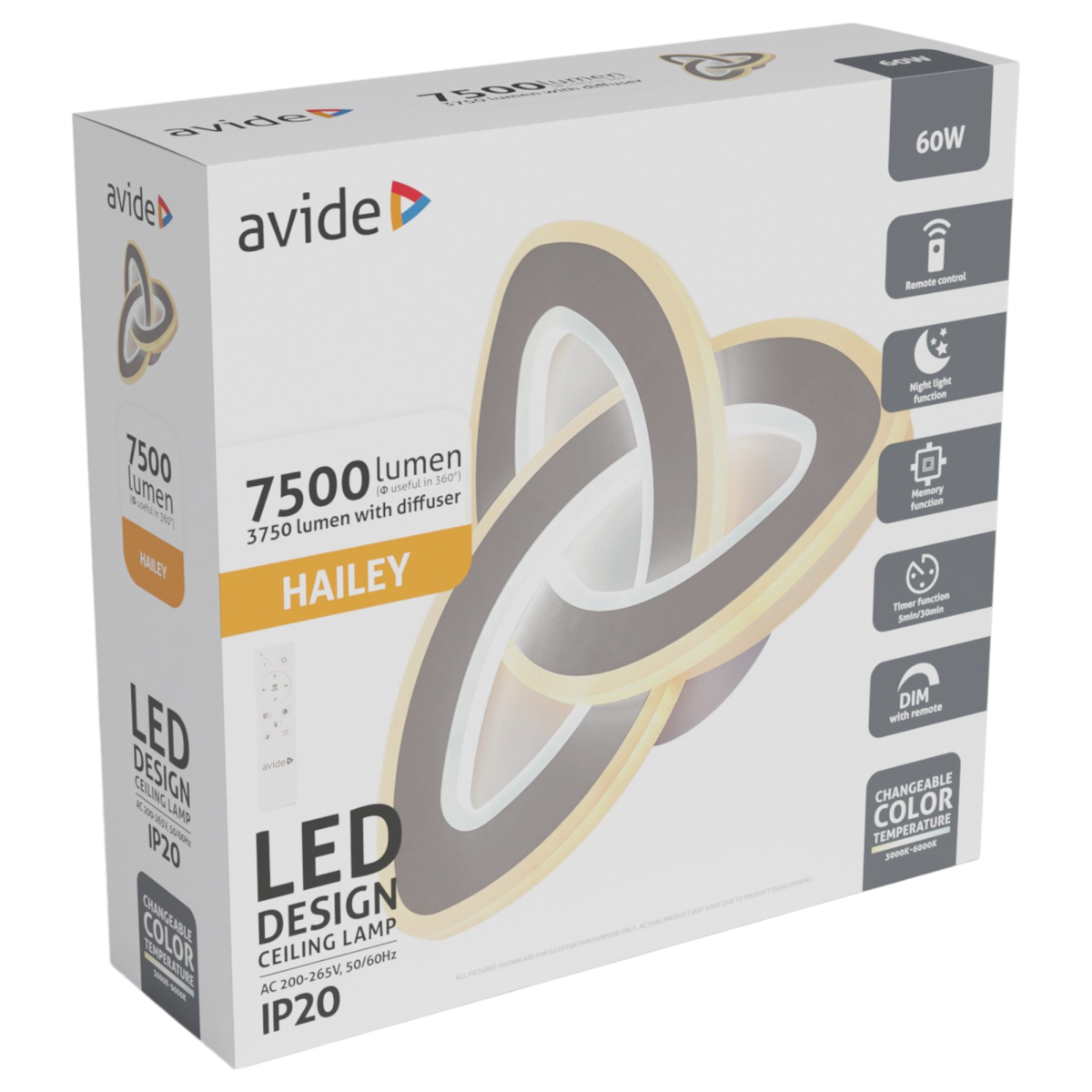 Az Avide Hailey design LED mennyezeti lámpa modern, letisztult formavilágával bármely beltéri tér stílusos kiegészítője lehet. A 60W-os teljesítmény 7500 lumen nyers fényáramot biztosít (diffúzor nélkül), amely diffúzorral együtt 3750 lumen értékben jut a helyiségbe, így erőteljes, mégis kellemes megvilágítást nyújt.