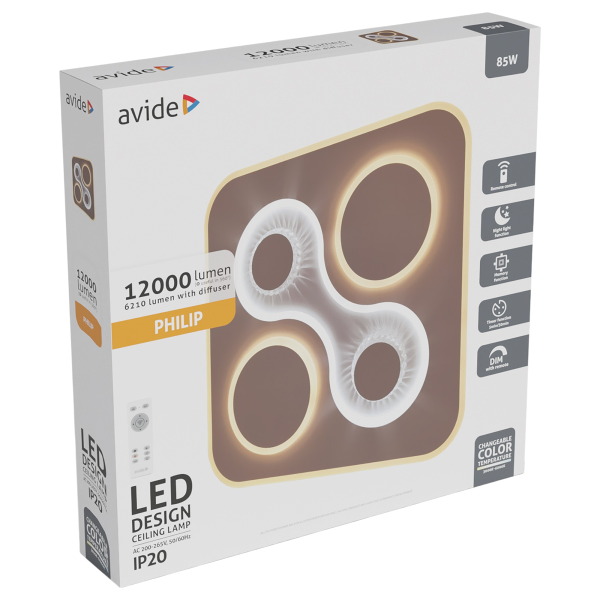Az Avide Philip design LED mennyezeti lámpa 85 W teljesítménnyel és 6210 lumen fényerővel biztosítja a nagyobb helyiségek megfelelő megvilágítását. Tri-mode színhőmérséklet-állítással meleg fehér (3000K), természetes fehér (4000K) és hideg fehér (6000K) fény is beállítható, a beépített dimmer funkció pedig lehetővé teszi a fényerő szabályozását. Modern gyűrűs kialakítása nemcsak elegáns, hanem egyenletes fényeloszlást is biztosít. IP20 védettsége beltéri használatra teszi alkalmassá.