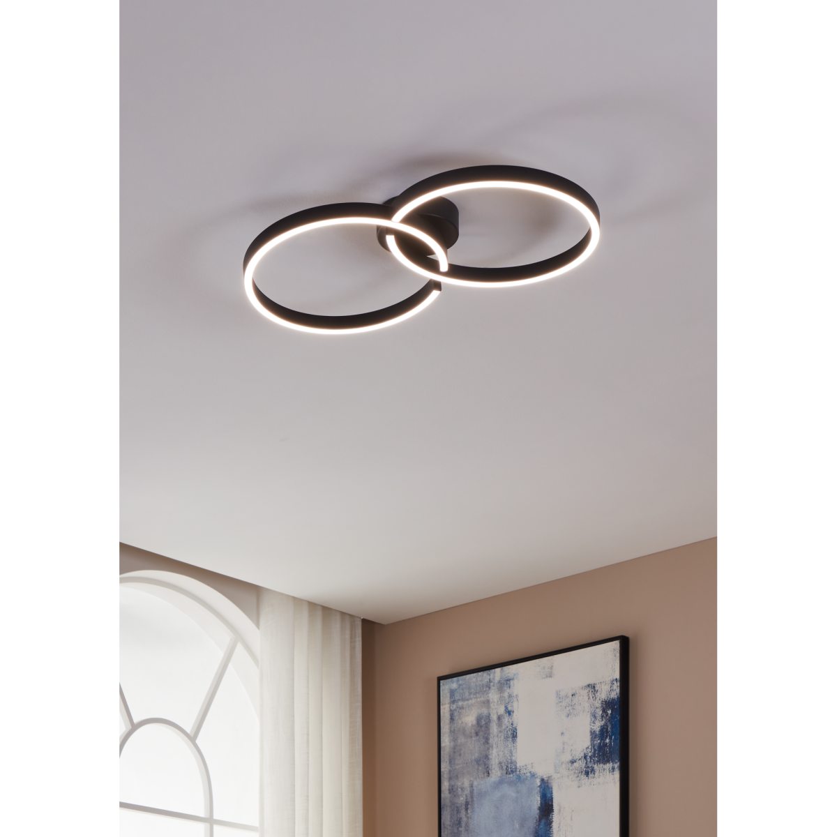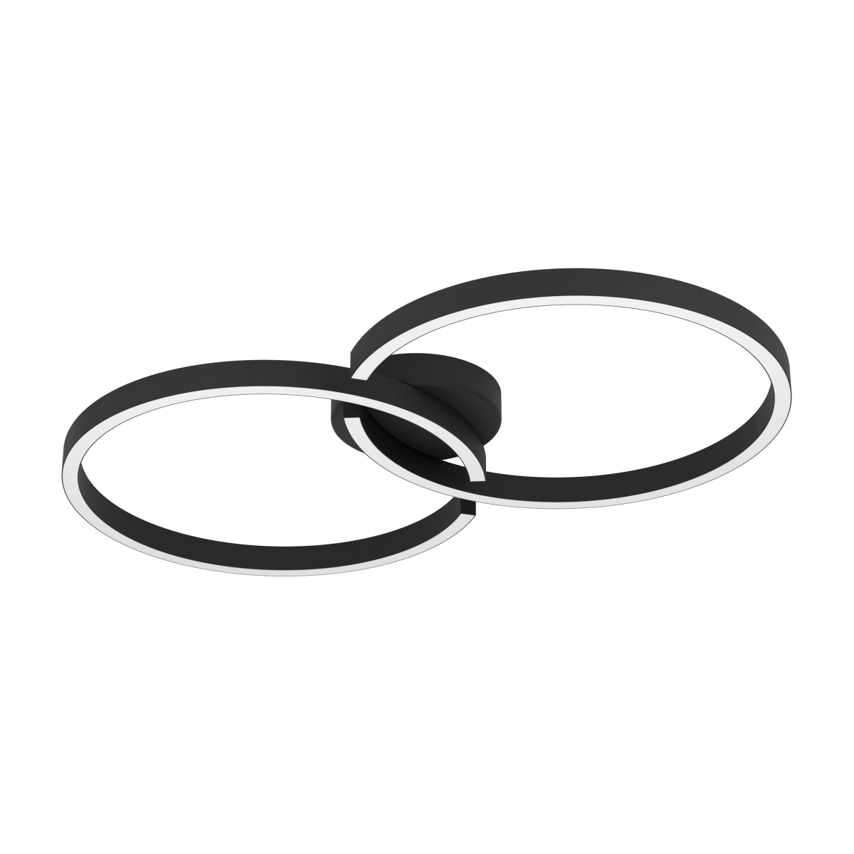 Fekete színű fém vázas kerek mennyezeti lámpa fehér színű műanyag búrával. 2700 - 6500 Kelvin között állítható színhőmérsékletű. Távirányítóval vezérelhető, mely tartozéka a terméknek