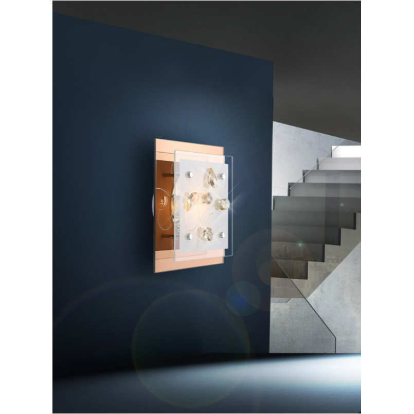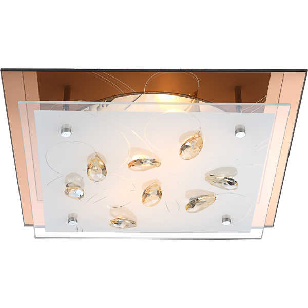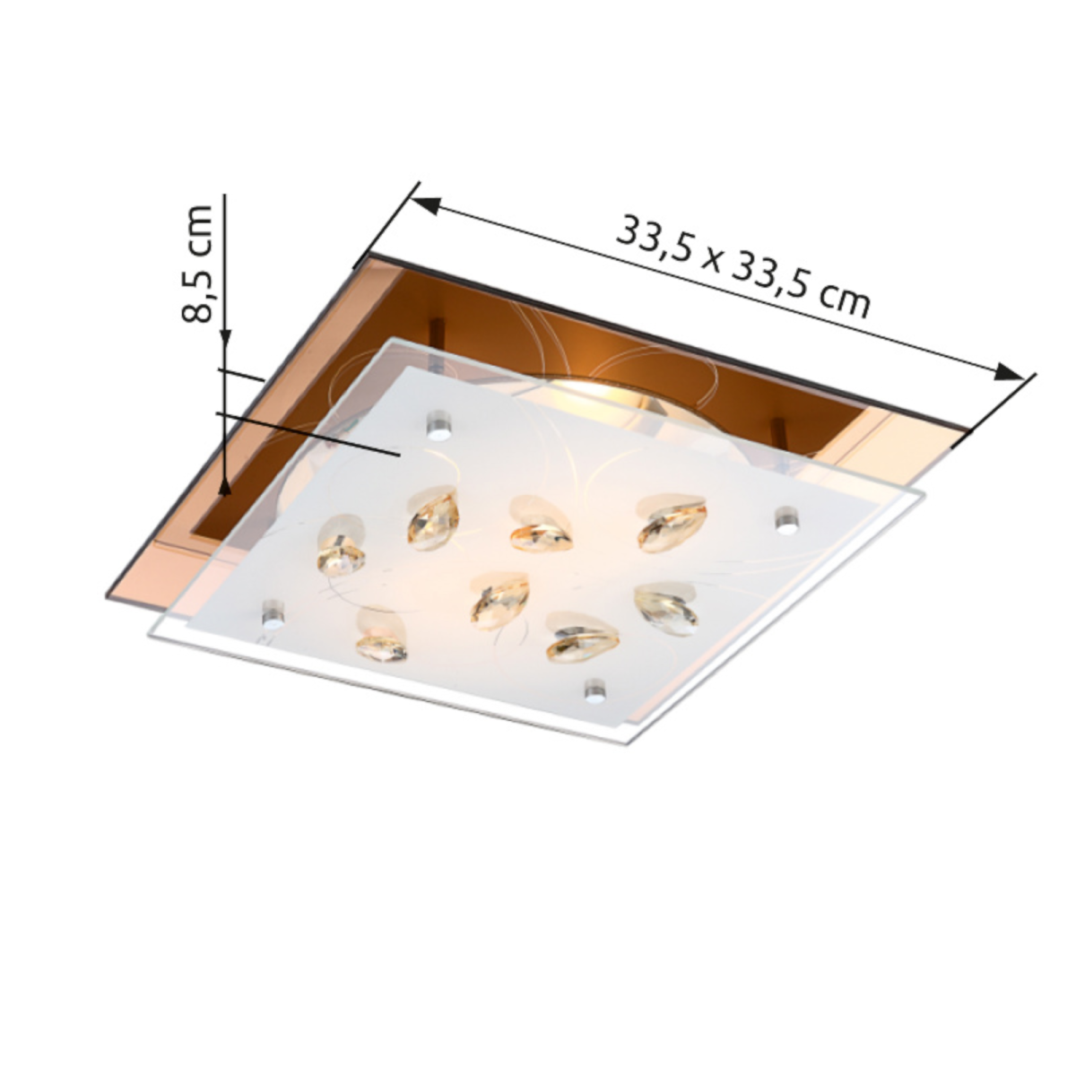 Különleges borostyán színű mennyezeti lámpa 3 méretben, mely lehetőséget biztosít, hogy egy szobán belül variálni tudjunk a méretekkel és fényerővel. A fehér üveglapon borostyán színű K5 tisztaságú ólomkristály gyöngyök ékeskednek. A lámpa lezárása plafon felett egy tükörlap, mely borostyán színű, kiemelve ezzel gyöngyök szépségét. Ez a középső méret mely 33,5X33,5 centiméter. Foglalata 3x E27, 40W. A fényforrást a lámpa nem tartalmazza, javasoljuk a takarékos fogyasztású LED fényforrás használatát a választható színhőmérséklete az alacsony fogyasztás, és a hosszú élettartam miatt. Az AYANA család része.