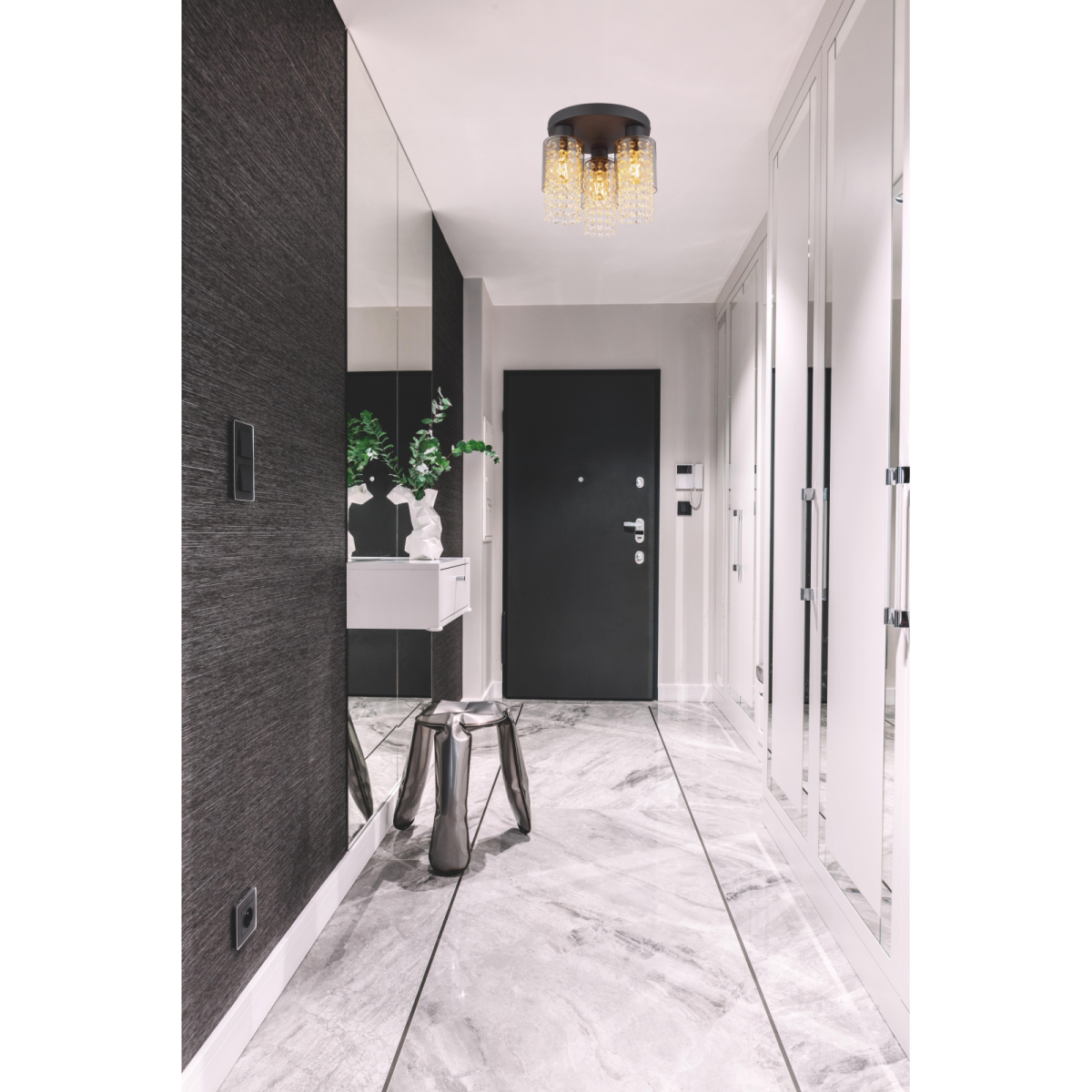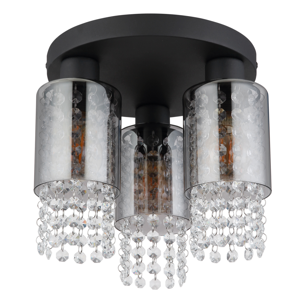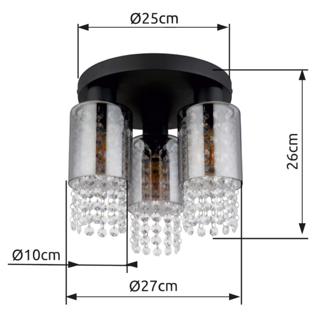 A GLOBO 15799-3D BACKEY sorozat elegáns mennyezeti lámpája nagyszerű dizájnnal rendelkezik. A kerek mennyezeti lámpatesttől (Ø 25 cm) három fekete matt fémrúd fut egy-egy E27-es foglalathoz, amelyeket füstszínű, kristály díszítésű, henger alakú üvegbúra vesz körül. Az E27-es foglalatok lehetővé teszik a fény színének és fényerejének megválasztását 3x15 W maximális teljesítményig. A hosszú élettartam és az energiatakarékosság miatt a LED izzókat ajánljuk.