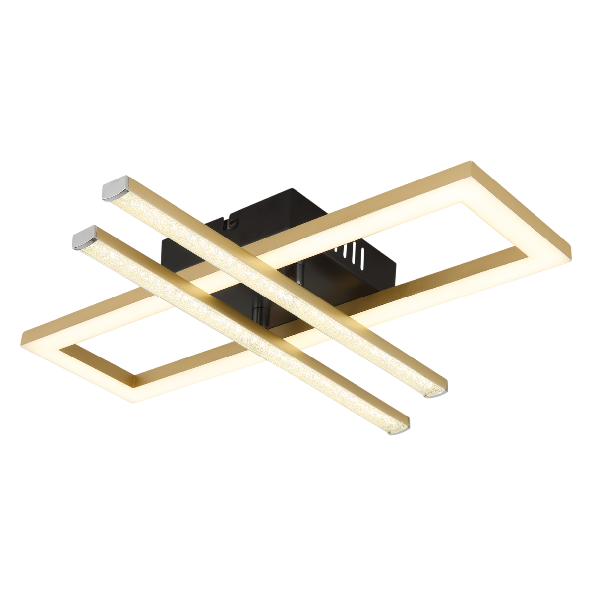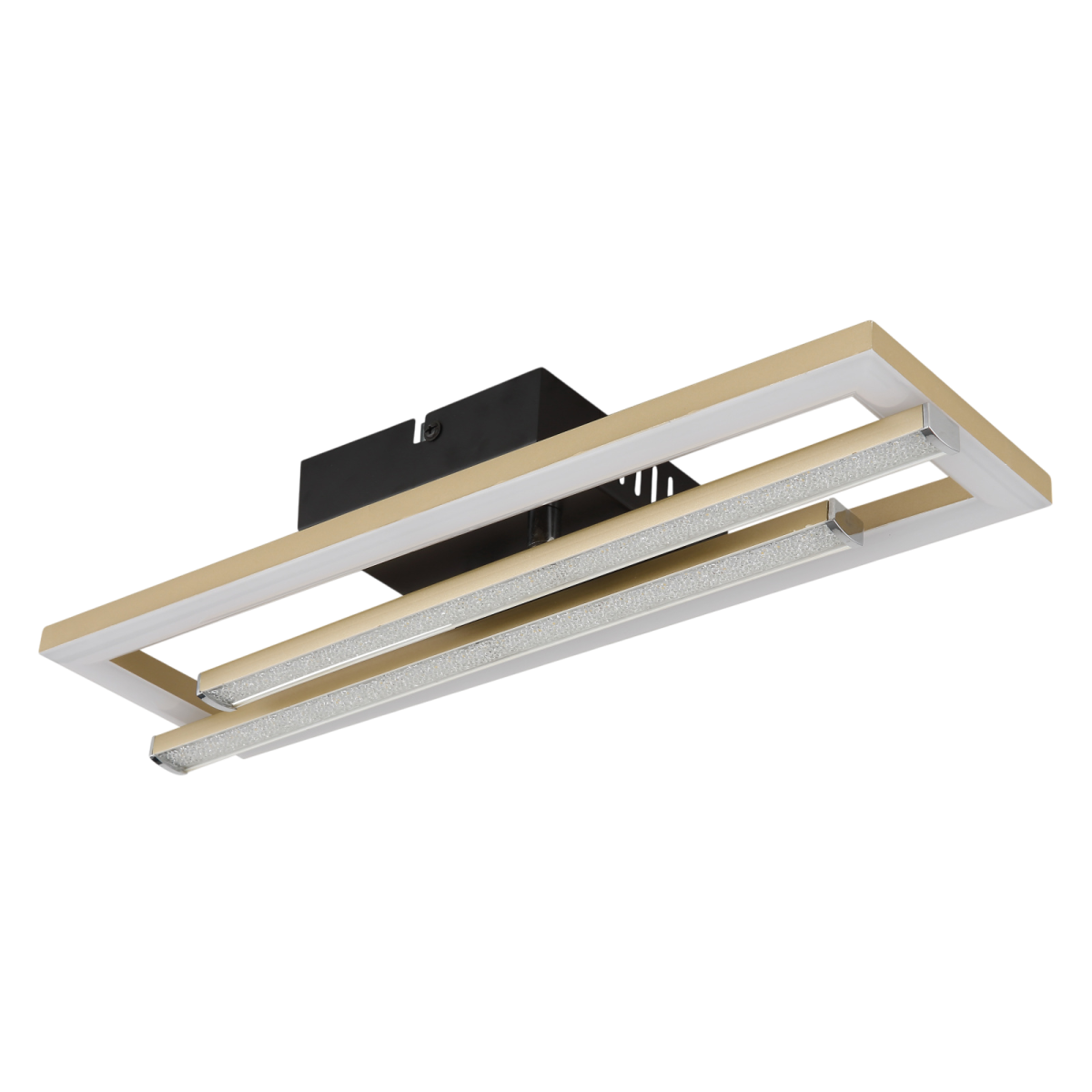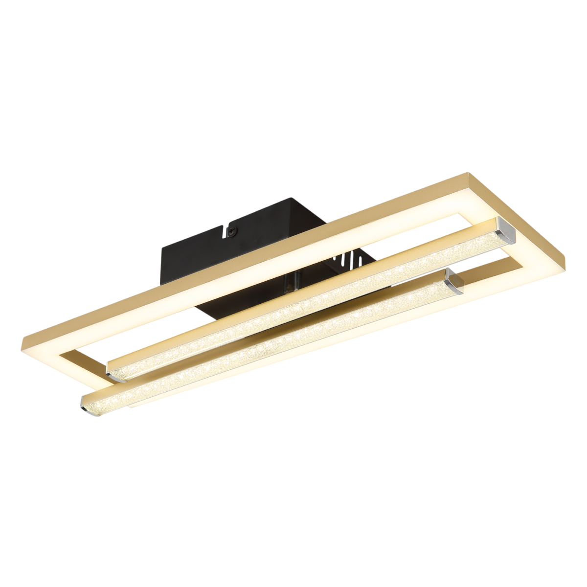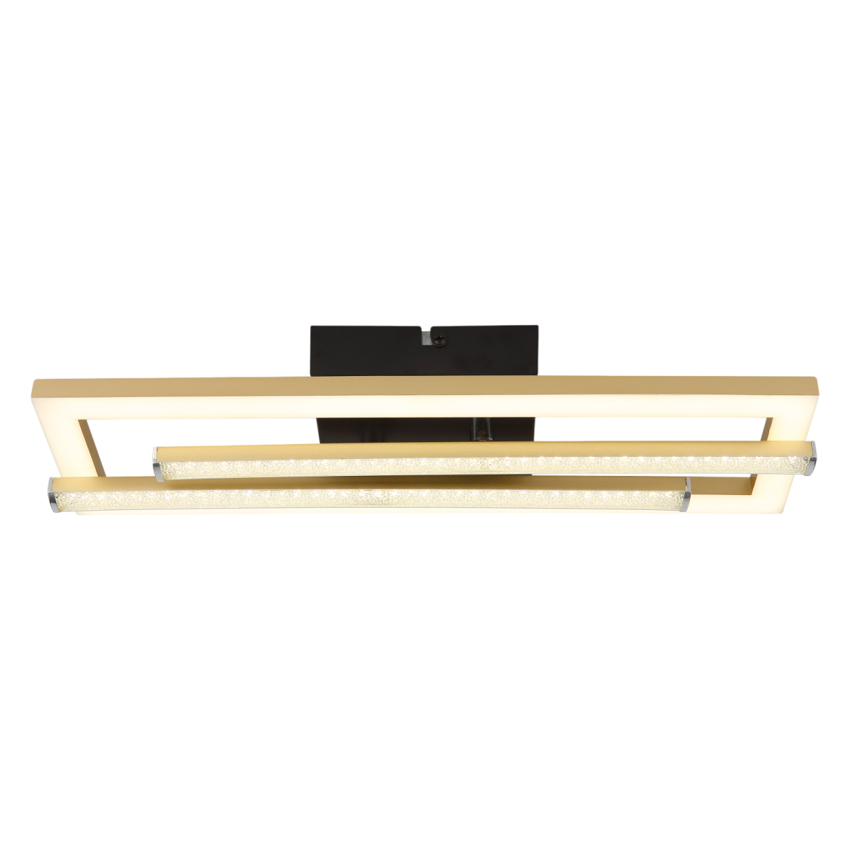 A GLOBO 672843G innovatív Highway mennyezeti lámpasorozatot egyedi megjelenés és funkcionalitás jellemzi. A téglalap alakú test matt fekete műanyagból készült. A búra matt arany színű műanyagból készült középen két forgó rúddal, amelyek átlátszó/fehér műanyag kristályokkal vannak kirakva, így a fény egyénileg állítható be.