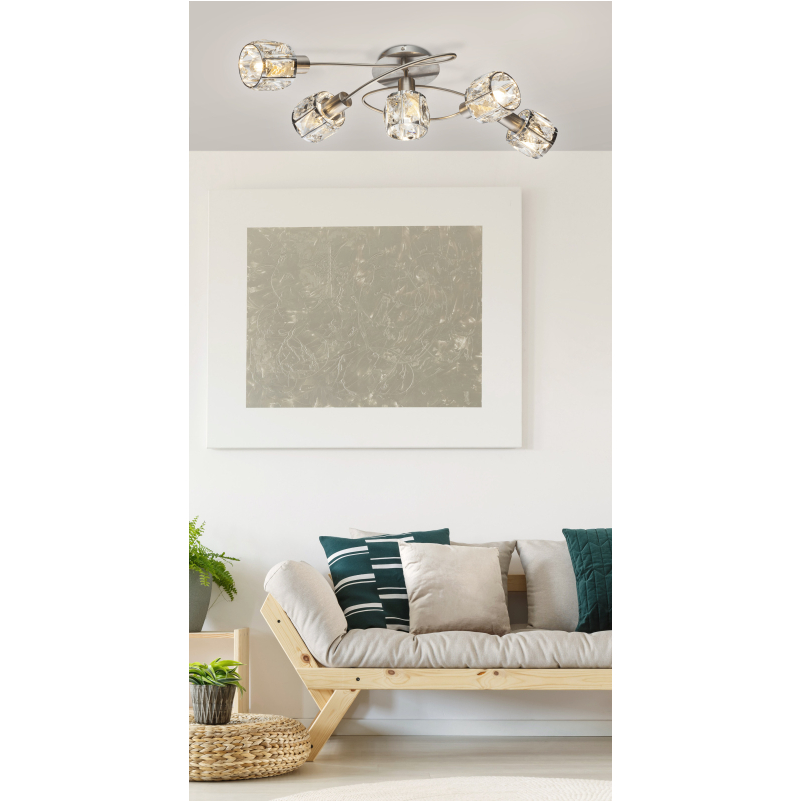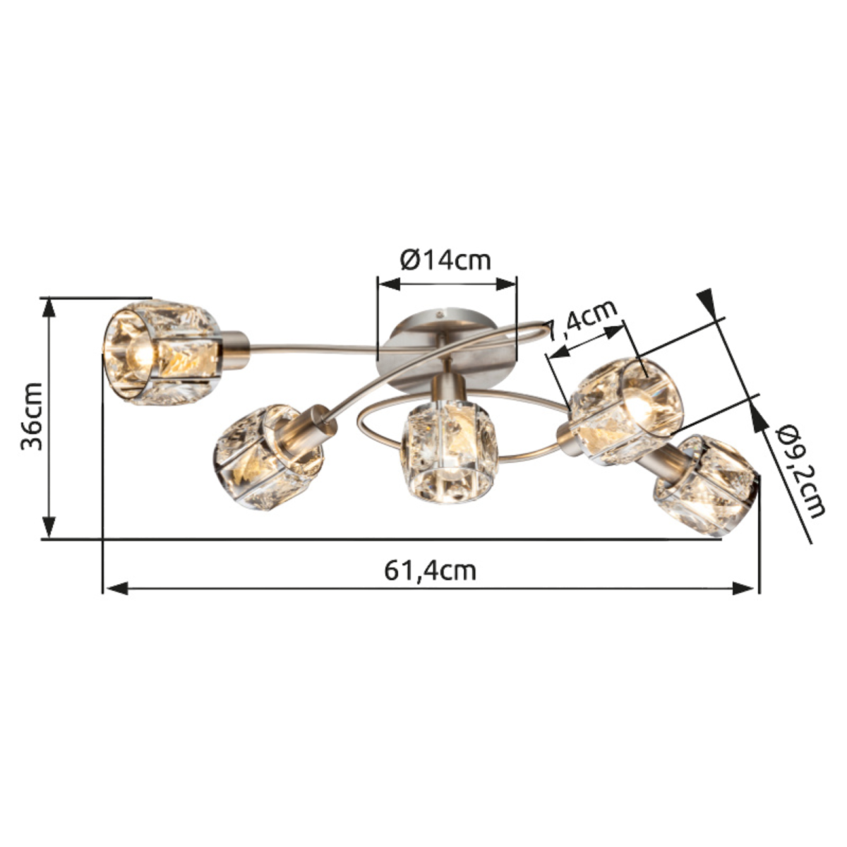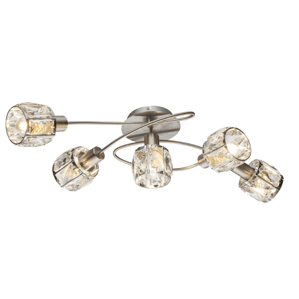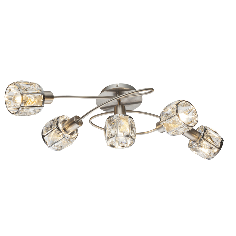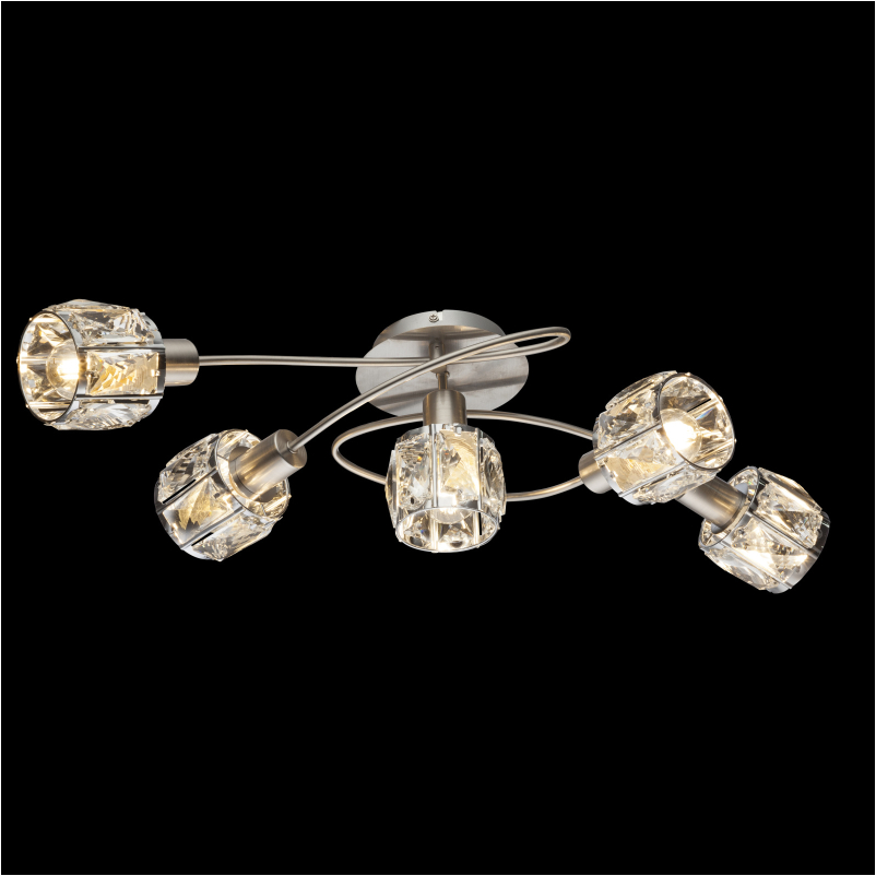 A Kris mennyezeti lámpa nikkel matt vázból és egy elegáns víztiszta üveg-kristály alkotta fejből áll, így igazán elegáns megjelenésű. 5 db E14-es foglalattal rendelkezik, mely 5 db maximum 40W teljesítményű fényforrással üzemeltethető.