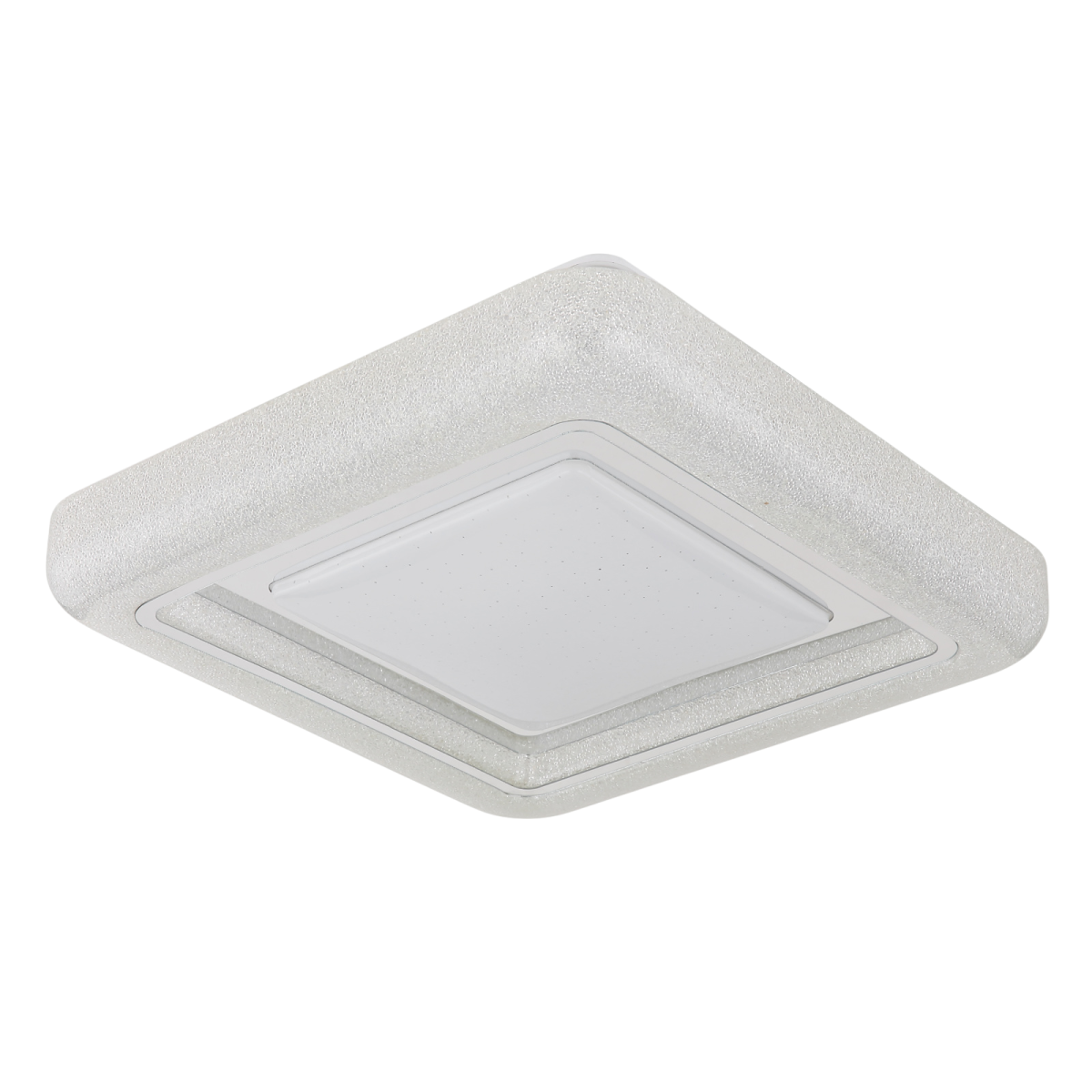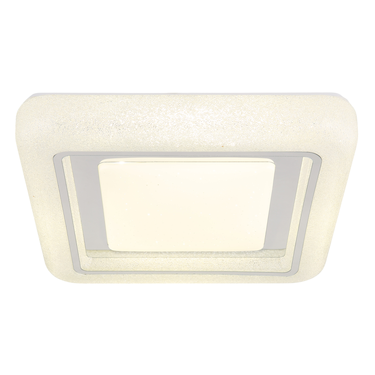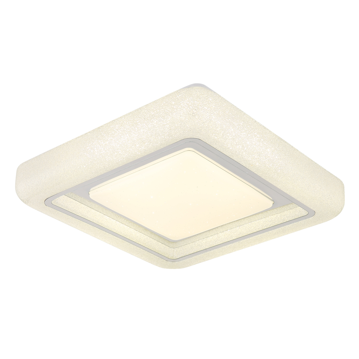 A négyzet alakú mennyezeti lámpa, kristály szegélyével és csillogó hatásaival elegáns világítási megoldást kínál. A fehér fém test és az átlátszó műanyag kristályokból készült búra luxus megjelenést kölcsönöz.