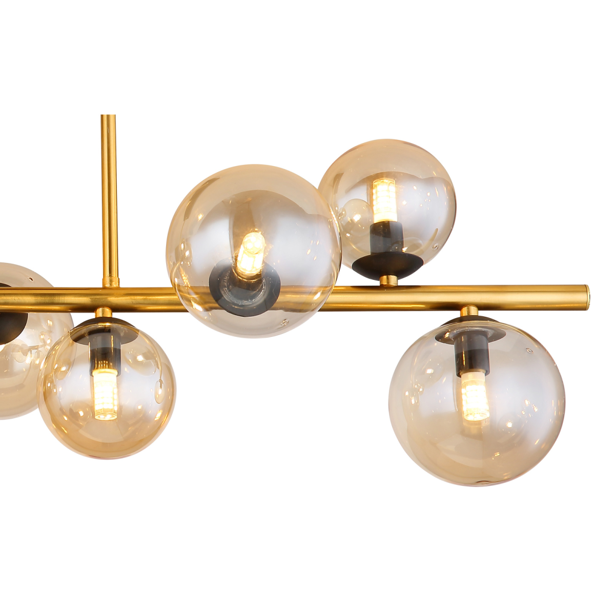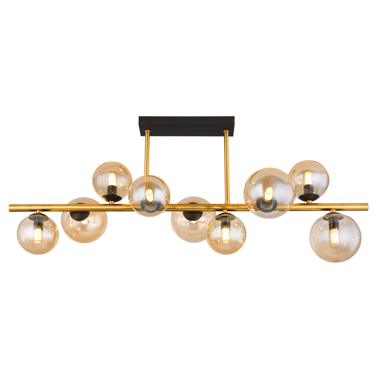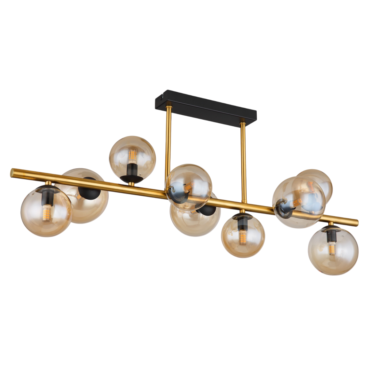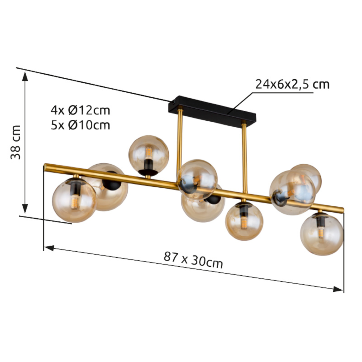 Ez a csodás mennyezeti lámpa a Riha termékcsalád tagja, nagyszerű dizájnja szemet gyönyörködtető. Egy keskeny, fekete mennyezeti konzolon két sárgaréz színű rúd fut függőlegesen egy 87 cm hosszú fémrúdhoz, amely kilenc darab G9-es foglalatú LED fényforrással rendelkezik és különböző méretű borostyánsárga színű üvegbúrákkal van felszerelve. A fényforrás 3000 Kelvin meleg fehér fényt bocsát ki, így kellemes légkört teremt.