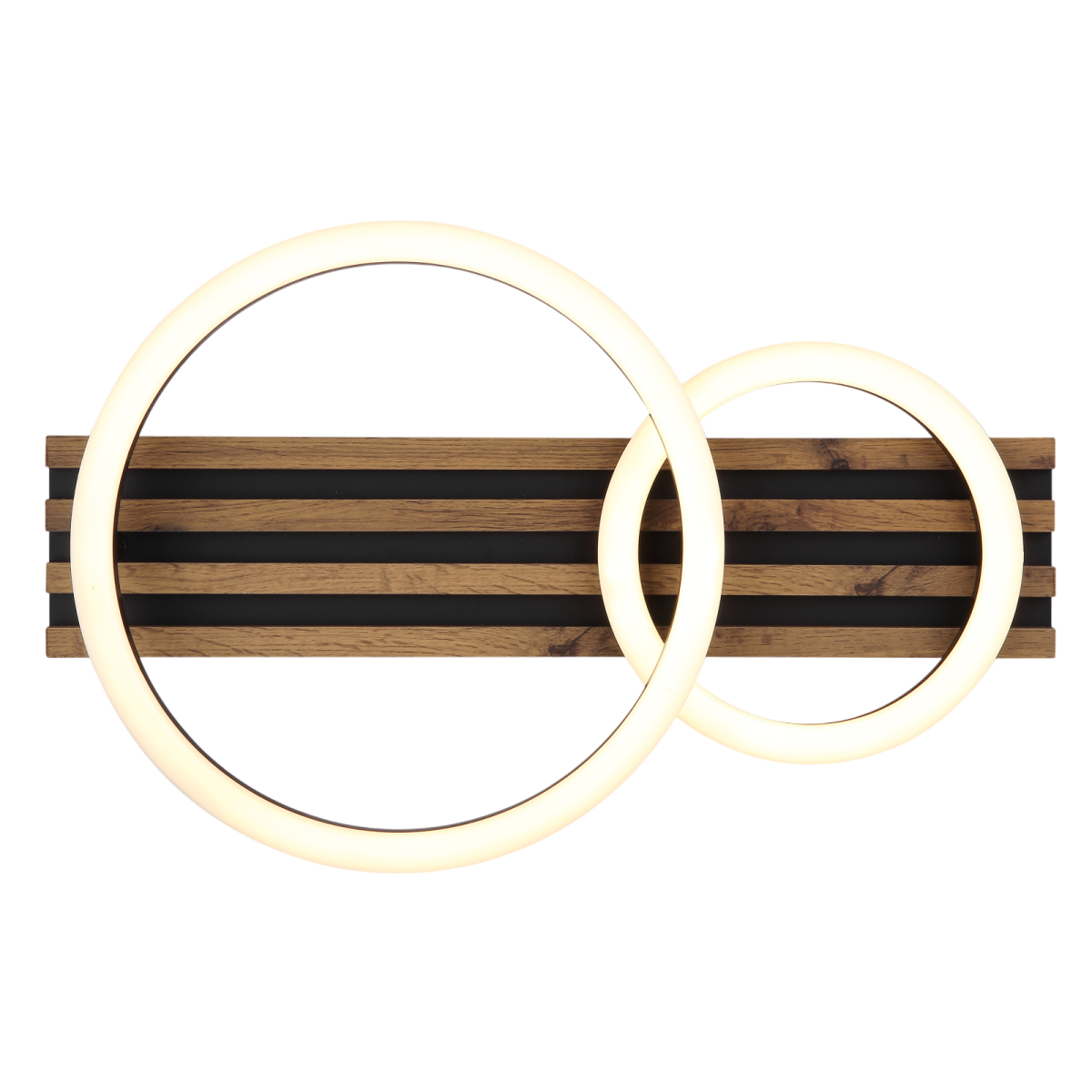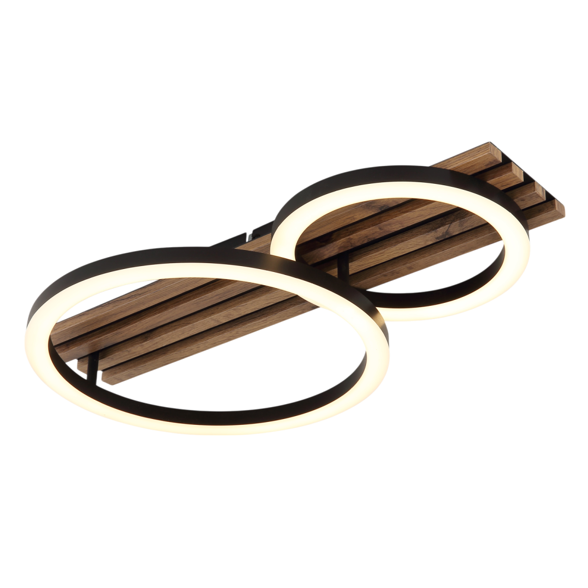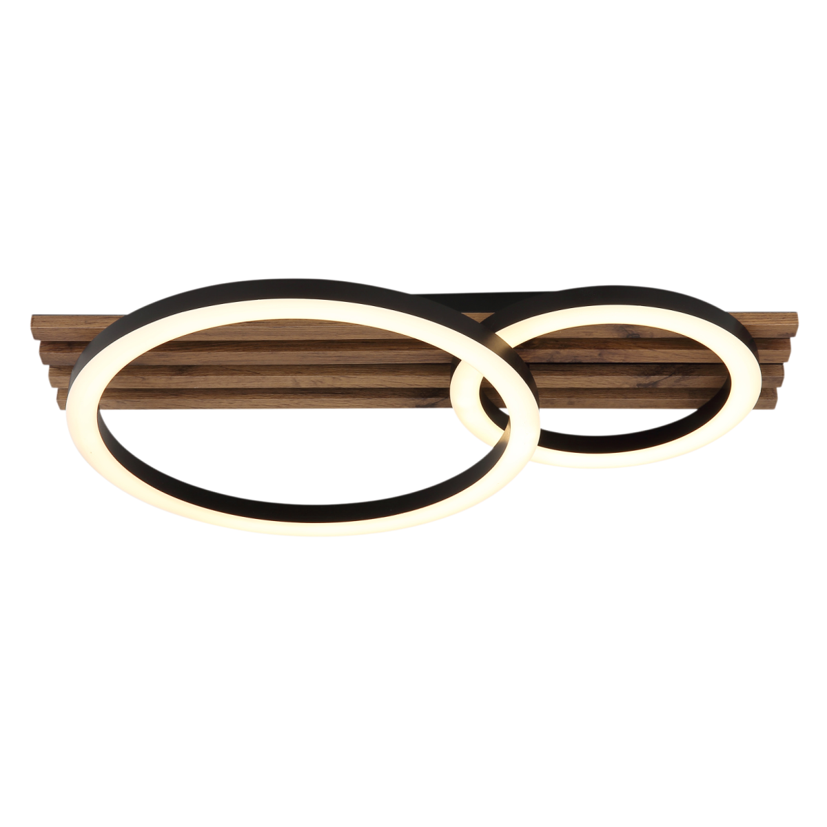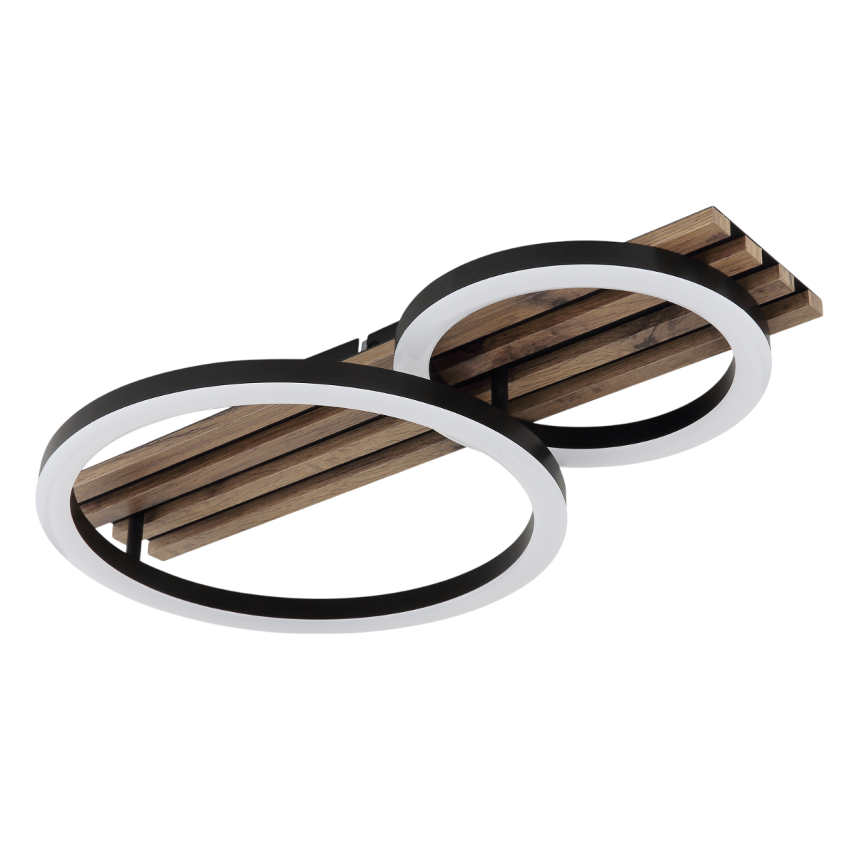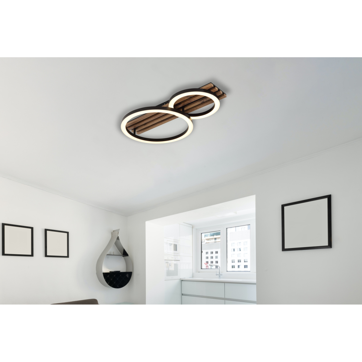 A Tisha mennyezeti lámpa a modern dizájnt a praktikus funkcionalitással ötvözi. A téglalap alakú test két elegáns gyűrűvel lett felszerelve, amely tökéletesen illeszkedik a különböző lakberendezési stílusokhoz. A fekete, matt fémből és MDF-ből készült, sötét fa megjelenésű test stílusos és természetes megjelenést kölcsönöz. A matt fekete műanyagból és fehér műanyagból készült búra egyenletes és kellemes fényeloszlást hoz létre. A lámpa 480 mm hosszával és 300 mm szélességével tökéletesen illeszkedik nappaliba, folyosóra vagy hálószobába.