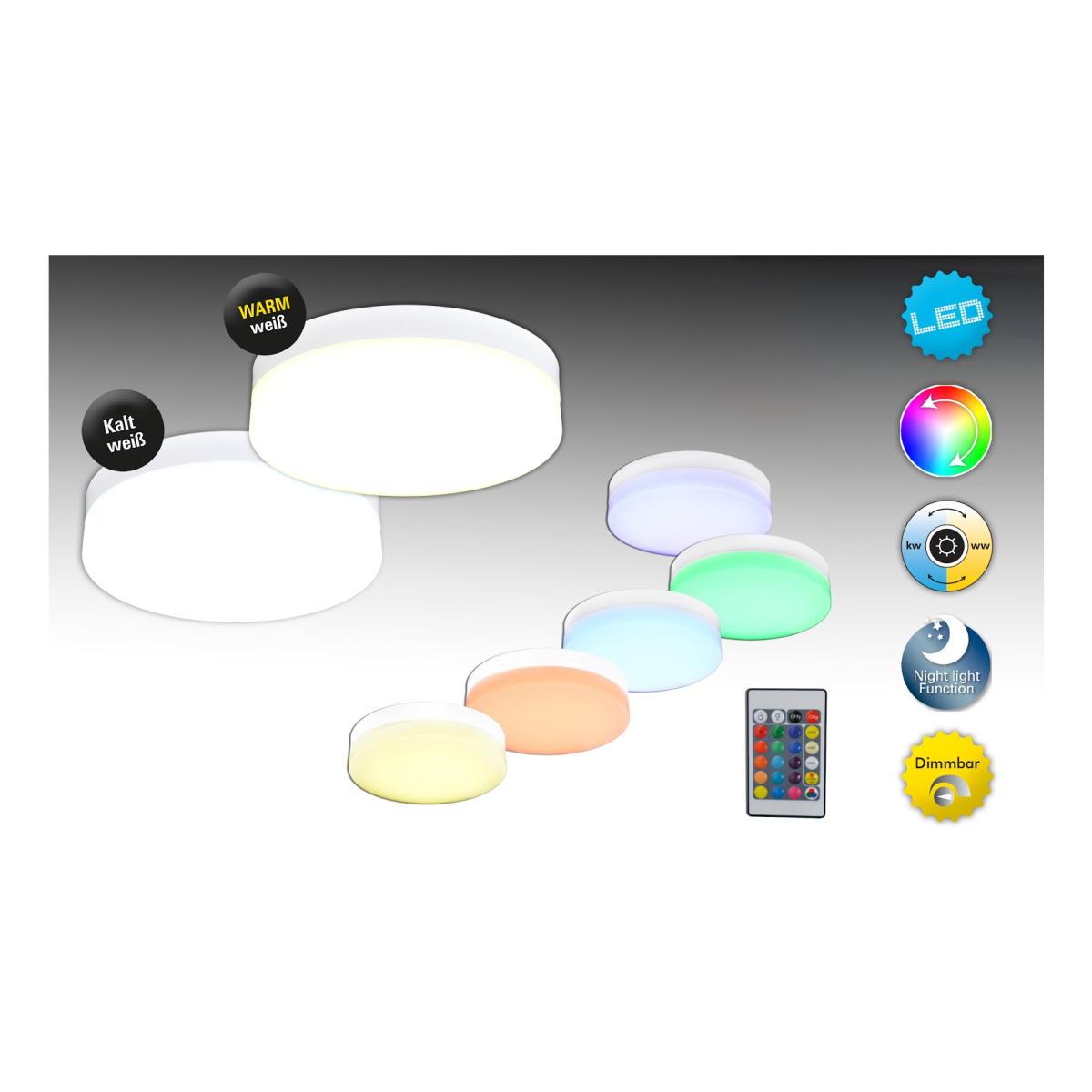 Cool RGB LED fali/mennyezeti lámpa - 35xLED Typ 2835 + 35xLED Typ 5050 RGB -3000K, 720Lm - 9W, beépített trafó; 200-240V~50/60Hz - Átmérő:25,5cm- Magasság:8cm - Fém, PVC - Fehér - Távkapcsoló tartozék