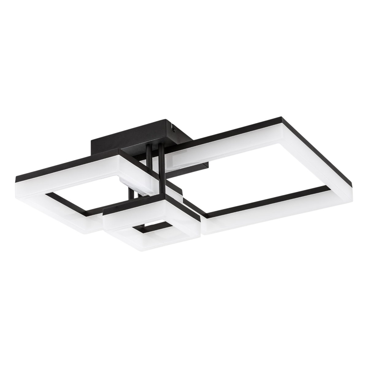 A lámpa különlegességét három, egymással összekapcsolódó, eltérő méretű négyzet alakú lámpaelem adja, amely egyedi, geometrikus megjelenést biztosít. Elegáns fekete fém testtel és fehér műanyag búrával rendelkezik, így könnyedén illeszkedik modern enteriőrökbe. A szögletes, fekete dísztalp stabil rögzítést kínál a mennyezeten, és harmonikusan egészíti ki a kompozíciót.