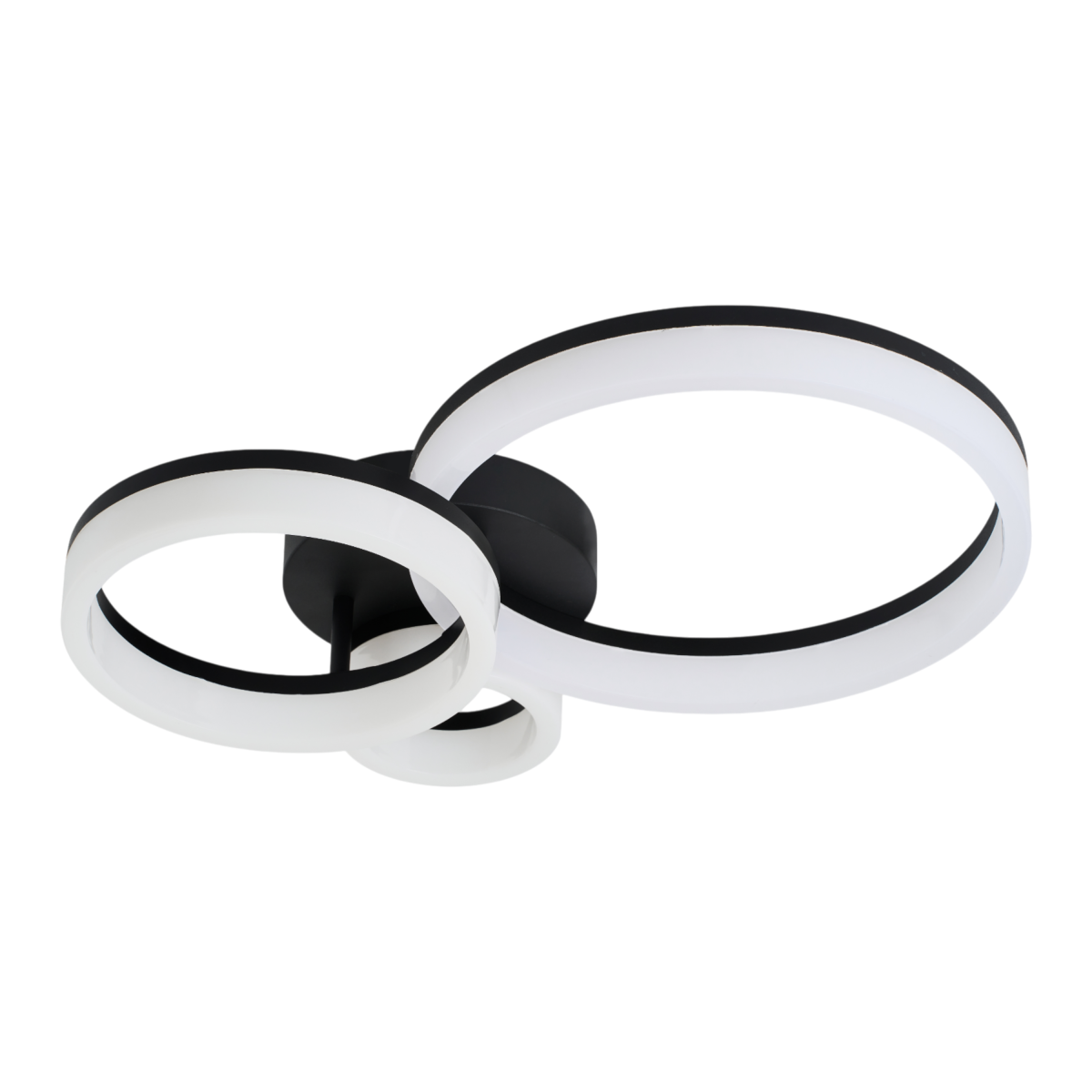 A fekete-fehér színkombináció modern, letisztult hangulatot kölcsönöz, amely jól illik a korszerű otthonok enteriőrjeihez. A fém test és a műanyag búra biztosítja a tartósságot, miközben a három különböző méretű, gyűrű formájú lámpaelem látványos, harmonikus fényhatást teremt.
