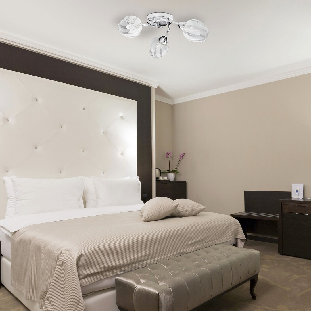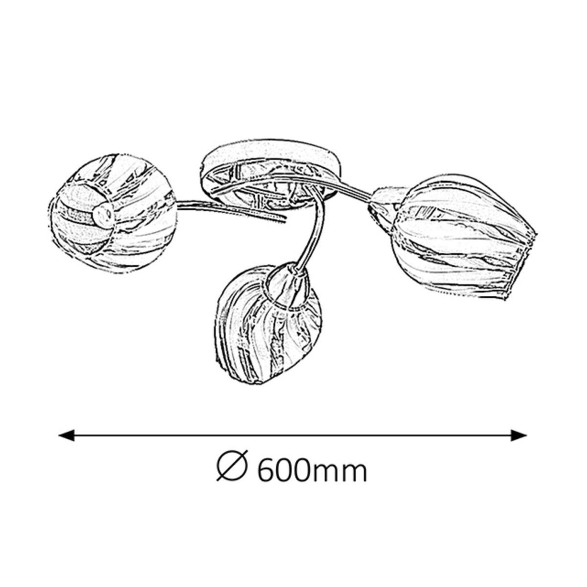 Modern megjelenésű mennyezeti lámpa 3 db foglalattal. 60 cm átmérőjű, króm színű, fémből készített test és üveg lámpabúrák. A lámpatest E27-es foglalat kialakítású, maximum 3x60W teljesítményű fényforrásokkal használható.