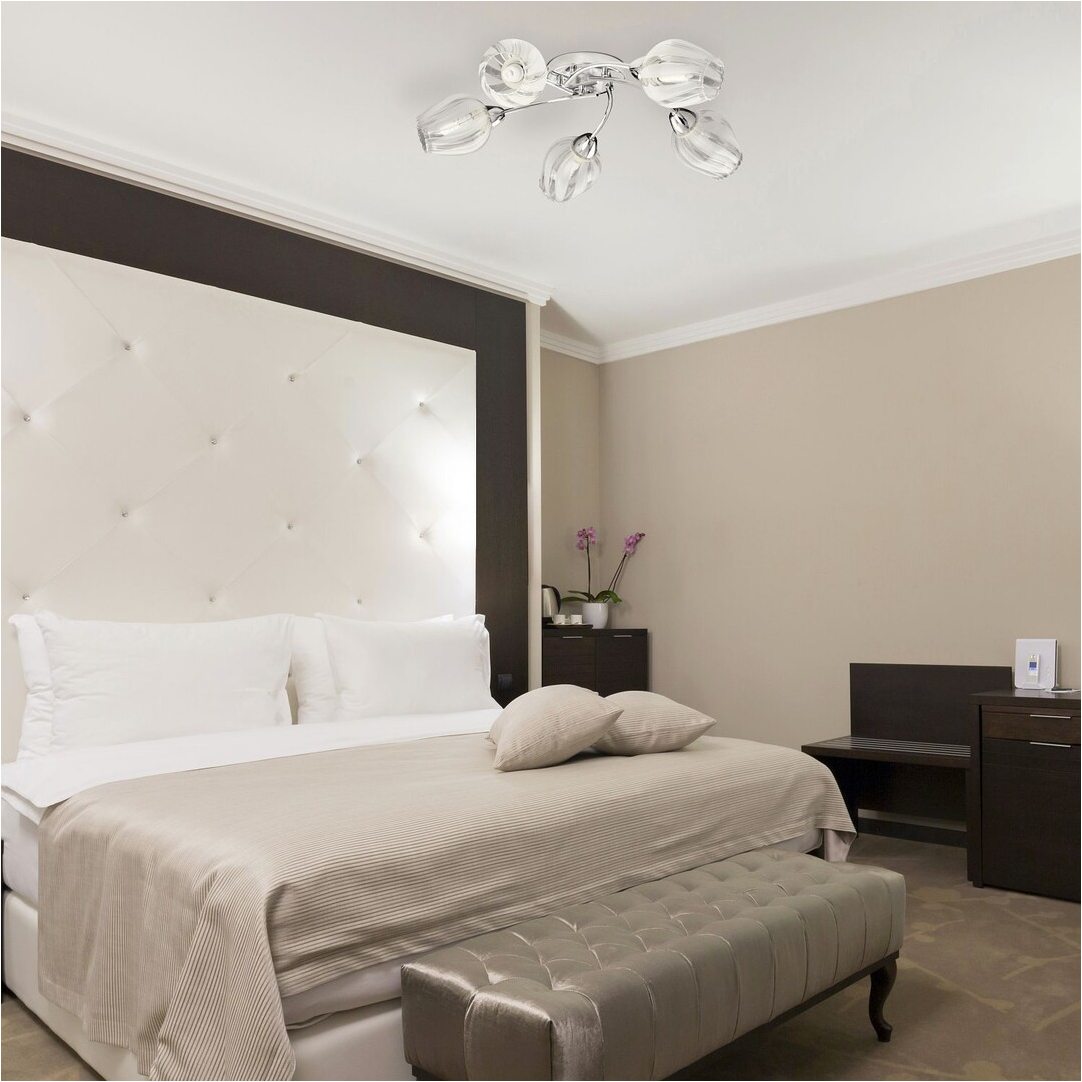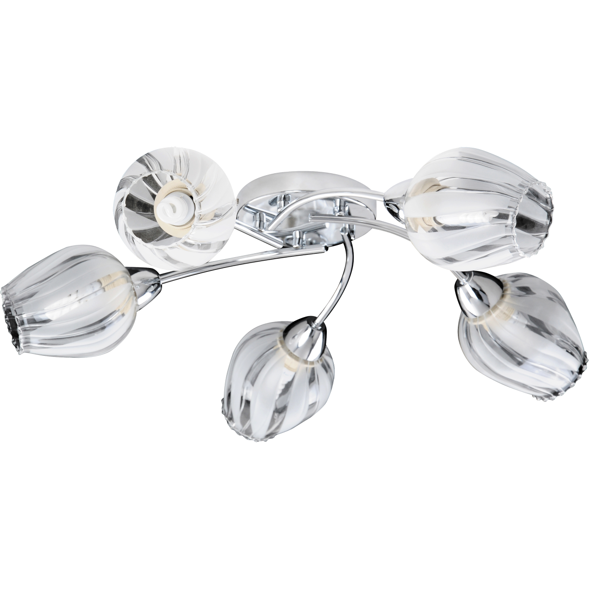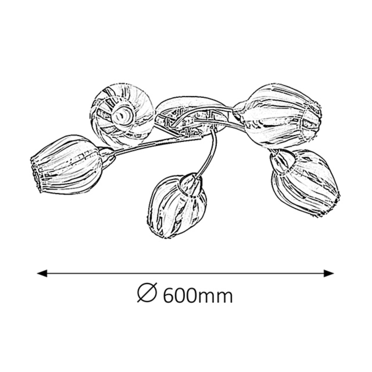 Modern stílusú mennyezeti lámpa 5 db foglalattal. 60 cm átmérőjű, króm színű, fémből készített test és üveg lámpaburák. A lámpatest E27-es foglalat kialakítású, maximum 5x60W teljesítményű fényforrásokkal használható.