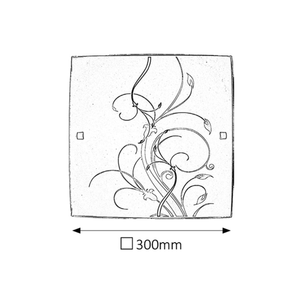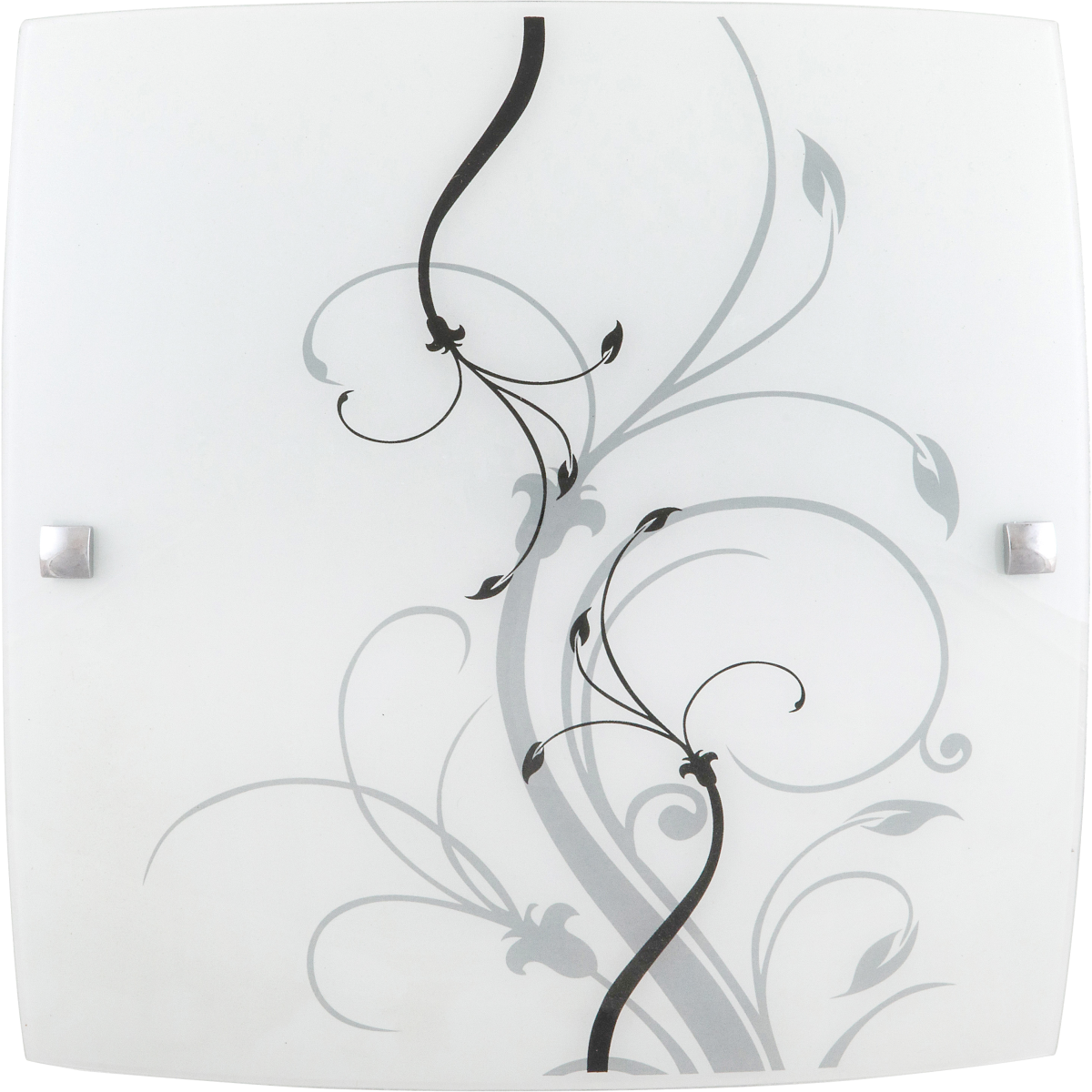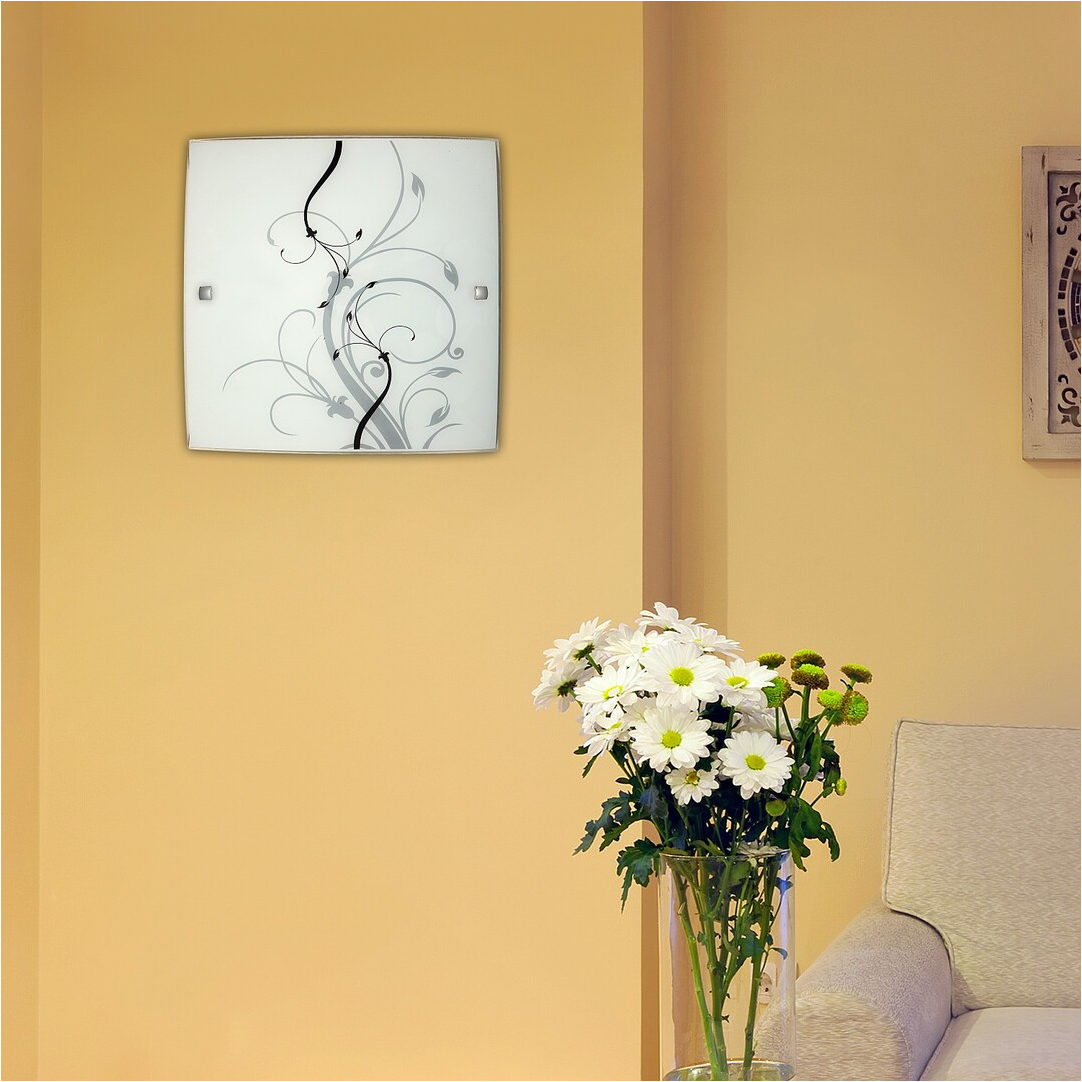 30x30 cm-es, romantikus megjelenésű mennyezeti lámpa. Fém szerkezet fehér domború opálüvegen, fekete-fehér mintával. E27-es foglalatú, maximum 60W teljesítményű fényforrással használható.